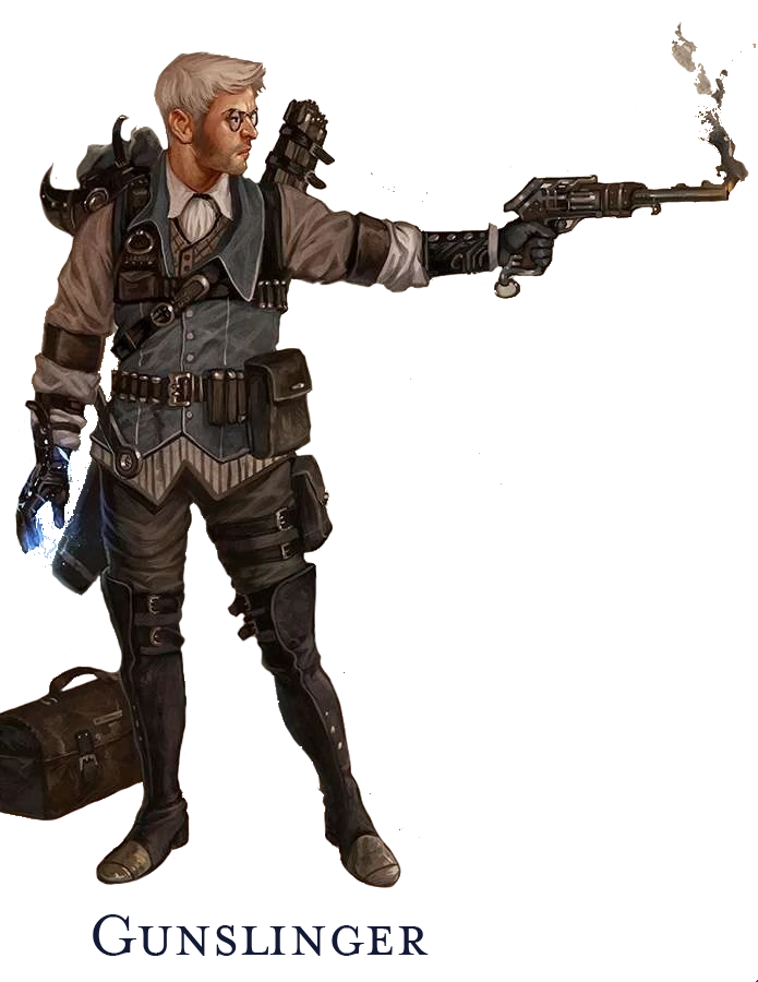 Gunslingers thrive on the outskirts of civilization, both famous and infamous in the more free-spirited areas of the world. Talk with your DM about an appropriate origin for your Gunslinger. Do you live in a city, where your weapons are possibly outlawed? Or, perhaps, you come from the frontier, where your kind are common and the laws, less so. How did you acquire your first gun? Did your fervor for invention lead you to create something more powerful than you know? Did a demon trade this knowledge for the promise of a favor? Maybe you killed a vengeful foe and took your gun off his dead body.