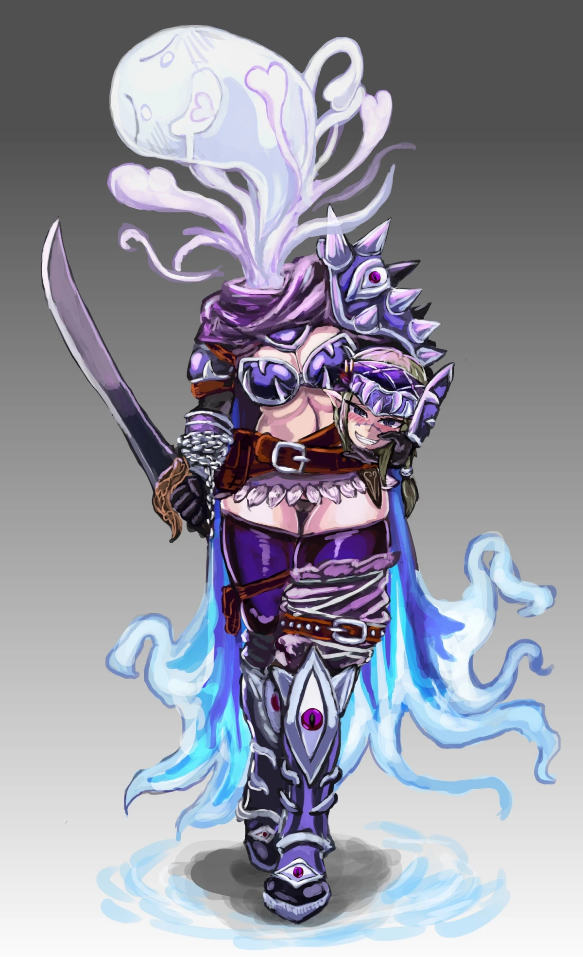 The Dullahan often resemble headless humanoids, usually carrying the "missing" head by their side or holding it by their long, often braided, hair. Their skin is of a pale sickly ethereal blue, and seems to be quite smooth, revealing their partial undead nature, and an ethereal mist can be seen dissipating from where the head should be. Their eyes, which are small and black, come in a variety of iris colors that range from natural to unnatural, and always seem to dart about like malignant flies. The entire head glows with the pale phosphorescence of decaying matter and the creature may use it as a lantern to guide its way.