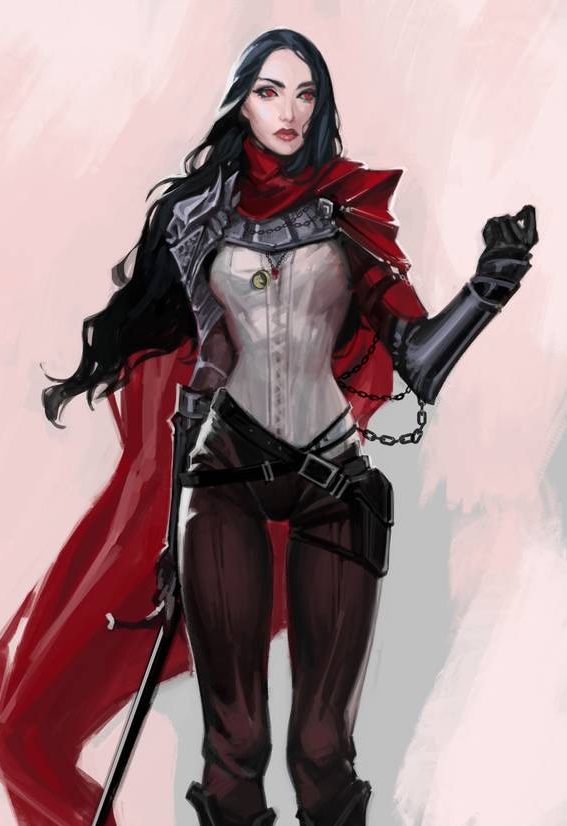 Sometimes the best disguise is being the most obvious thing in the room. She dons a voluminous blonde wig and dresses in fine (and alluring) clothing, adding makeup both to enhance her looks and subtly disguise the features that mark her as Vistana. She tailors this one's behavior based off where she is and what she's doing, but the character is always bold, proud, and at least a little flirty. Her fancy clothing, like her hair, tends towards the voluminous, allowing her to stow weapons under all the frippery. She also had the clothing altered such that it is very easy and swift to remove all the foofy bits so she can rapidly get at her weapons and be free to fight if needed.