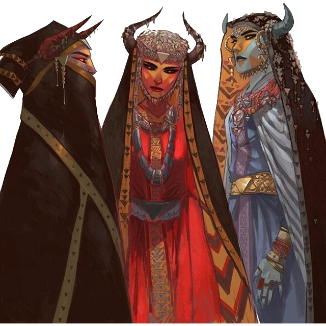 The Daughters, said to be the offspring of Alilah, rose up in rebellion against the Shayatan. They brought together other High Gods, forming the Alihat, and on the backs of ascendant dragons so large they darkened the skies, the gods overthrew the oppression of mortals and sealed the shayatan away in the House of Lies. The sister goddesses Al Hurani, Arimata, and Daea then crossed the Chinvat Bridge to rule from the heavens in wisdom and benevolence.