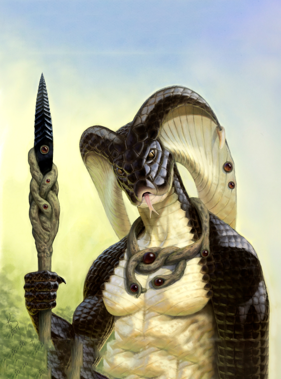Stories of where the yuan-ti came from vary, but it is certain that they used to be humans in ancient times. Some were slaves to even more ancient snake races and somehow bred with them overtime, eventually becoming the dominant species. Others were masters of great empires and made terrible sacrifices to reptilian gods to gain their current forms. Regardless of the details, the yuan-ti are not merely enhanced humans anymore. They have a vastly different view of the world, and this can lead to clashes between them and outsiders. Still, they retain a human curiosity, and while they dislike unexpected intrusions, they are often willing to chat with outsiders simply to satisfy that curiosity.