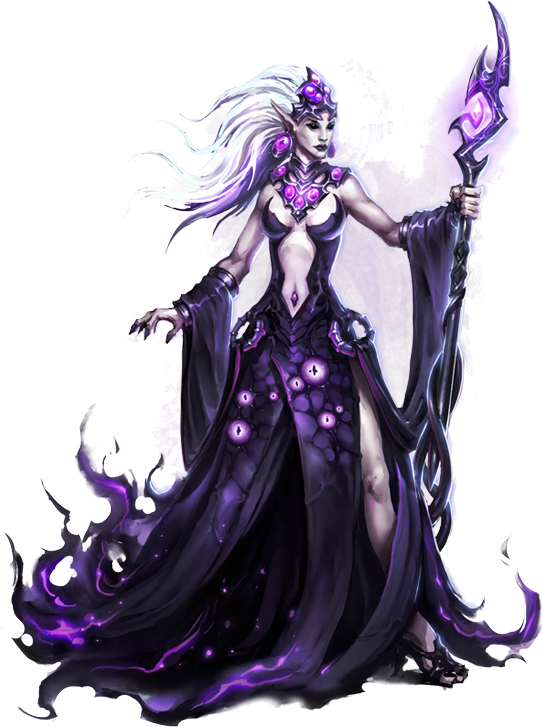 to Vil'ron. They are connected to the magical energy of the void and are direct descendants of the creator of the Universe - the Madam. These elves are tall and slender, have white or grey skintones, white or purple hair, black horns and black markings on their body and face.