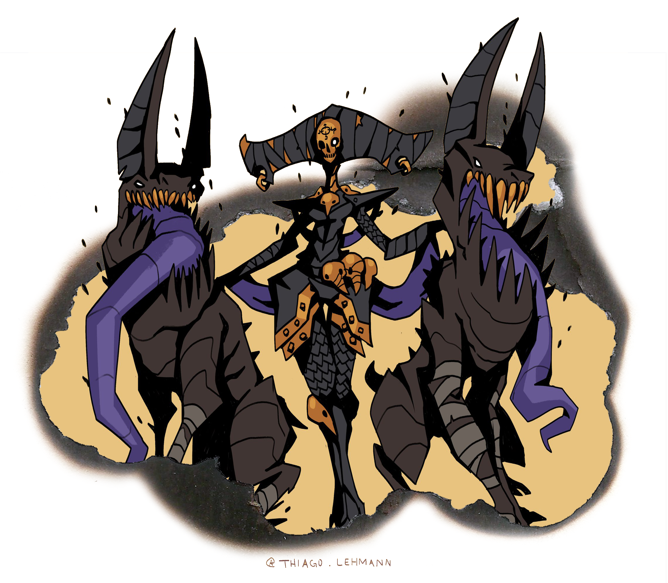 The deity cursed the gluttonous empress by sowing her mouth shut and transforming her stomach into an endless pit that could never be filled. The empress was driven mad by her unfulfilled desire to consume and the demon lord known as Gluttony was born. Gluttony has the figure of a spindly woman, skeletal appendages on an even thinner upper body. She wears a skeletal mask with the mouth sewn shut, craving endlessly for the food she can't consume herself. Instead, she devours her meals through the gaping maws of her two demonic hounds Hunger and Feast. These two beasts are soul-bound to their master and never leave her side. Cults of Gluttony indulge in orgies of excess and see the consumption of piles of expensive and extravagant food as the only joy in life. In death, they join Gluttony at her dreadful banquet, either as guests or to be consumed as well.