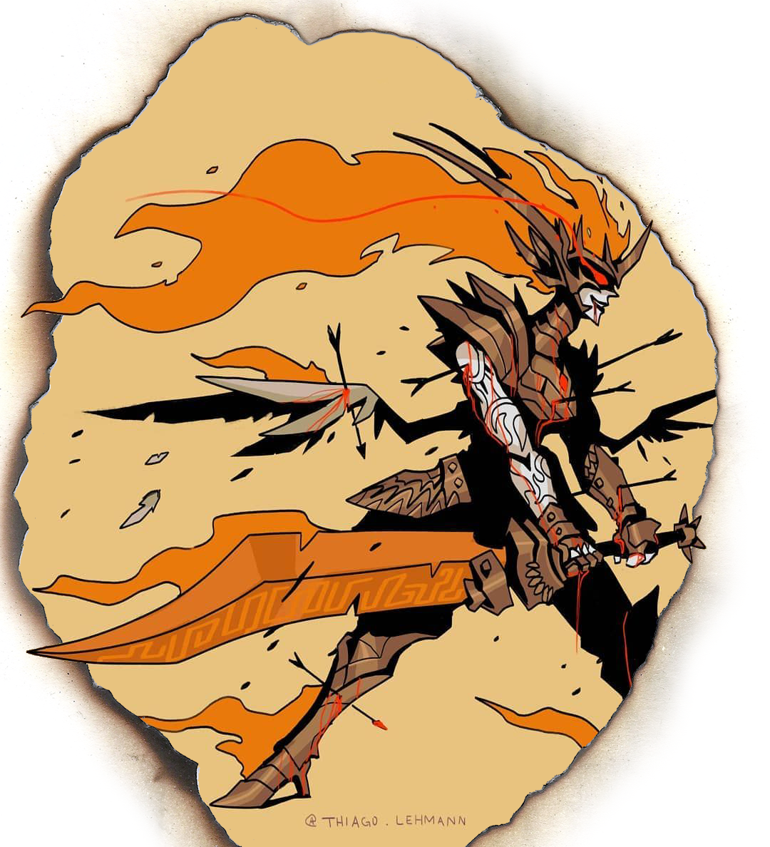 Pride is an 8 ft. tall humanoid with an uncanny perfect complexion. Her skin is white and smooth like porcelain, her features perfectly symmetrical. Her armour is spotless like newly made, for no creature was ever worthy for Pride to even lift a finger. However, when an opponent seems to rival Pride in her glory, flames of passion burst from her body and she won't stop assaulting them until she put them into their rightful place.
