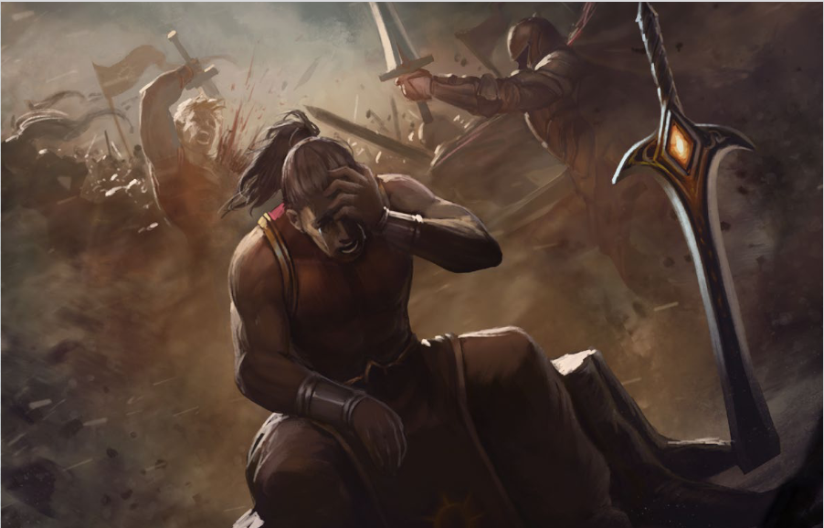 The exalted adventurer Malau breaks down in tears on the battlefield, succumbing to the Flawed Virtue of All-Consuming Grief. His foes ignore him and press against his weaker allies, knowing that should he be roused from his grief, he would turn about and cut them down in rage.