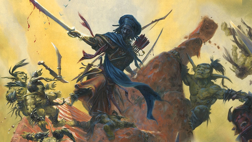 A human in clanging plate armor holds her shield before her as she runs toward the massed goblins. An elf behind her, clad in studded leather armor, peppers the goblins with arrows loosed from his exquisite bow. The half-orc nearby shouts orders, helping the two combatants coordinate their assault to the best advantage.