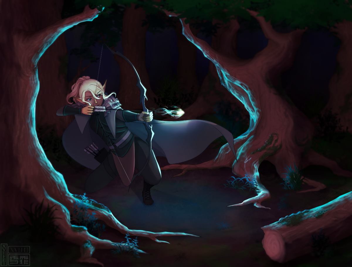 Holding his hand high, a half-elf whistles to the hawk that circles high above him, calling the bird back to his side. Whispering instructions in Elvish, he points to the owlbear he’s been tracking and sends the hawk to distract the creature while he readies his bow.