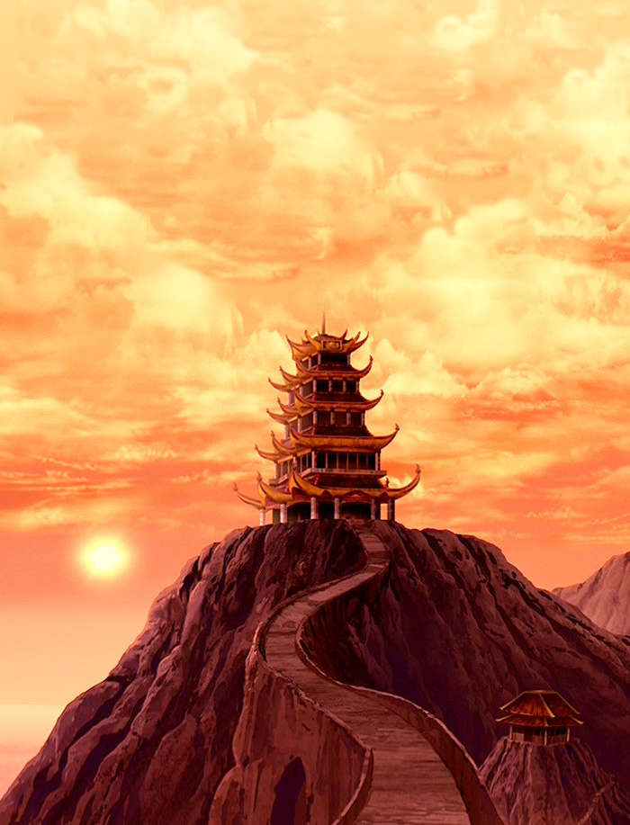 The Eastern Air Temple is located in a mountain range in the southeastern Earth Kingdom and was one of the two temples that exclusively housed female Air Nomads, the other being the Western Air Temple. Unlike the Northern and Southern Air Temples, the Eastern Air Temple is housed on three separate mountains, connected by bridges. Not much is known about its physical appearance, it has three pagodas, one on each mountain, with green tiled roofs. The center mountain pagoda has a couple smaller buildings next to it.