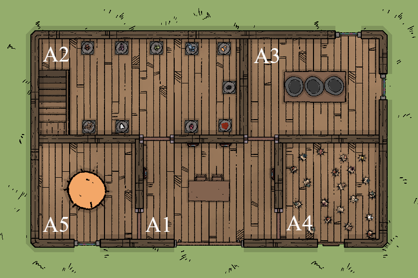 The building has three floors, each with windows of frosted glass making it impossible to see inside. With the exception of the top floor which is noticeably a conservatory; where the walls are lined with tall windows and the roof is sections of glass pane. Plants growing wild can be seen pushing against the glass from the outside and a few branches have broken through the roof’s windows. The front door is locked, DC 15 Dexterity (Thieve’s Tools) to lockpick, with a ‘closed’ sign hanging from its doorknob and there is no backdoor. There is a faded sign above the door: “Museum of Human History”, a name provided by the denizens. With a DC 10 Wisdom (Perception) check, adventurers will notice a single broken window on one side that leads into area A4. It has been boarded up and has a torn piece of fabric that adventurers would recognise as a piece of Jaylen’s clothing.