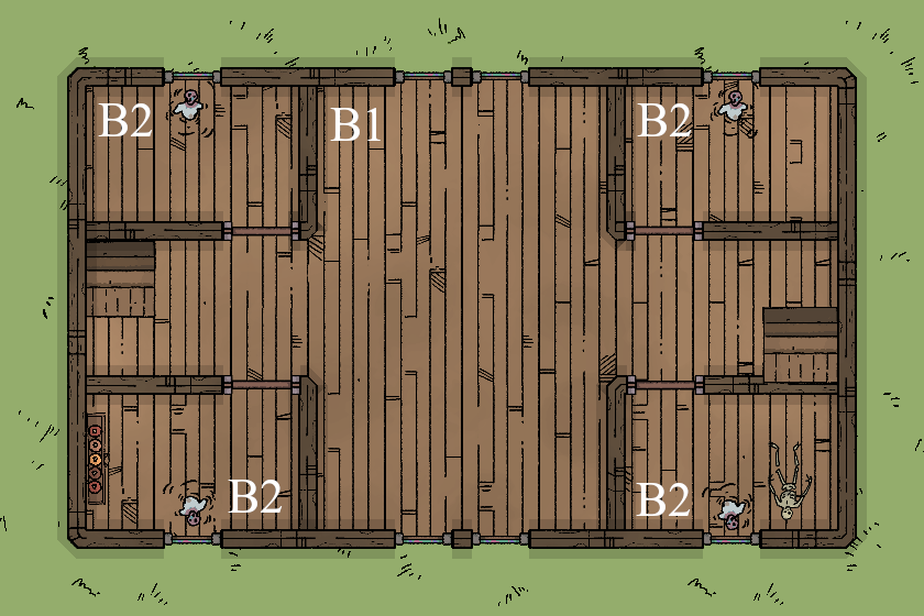 Empty stables apart from a pile of heavily mildewed hay, a single pitchfork laying on the ground and a few stiff coils of rope. A DC 13 Wisdom (Animal Handling) or Intelligence (Nature) check will determine this stable has never been used by animals.