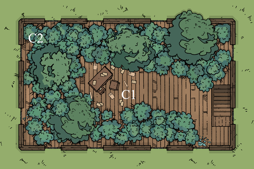 The majority of the top floor is covered in a large garden. It is mostly composed of bushes and small trees. The plants were originally in troughs or large pots but have since outgrown them; with roots breaking through any ceramics and snaking across the floor. The trees’ branches weave together to make a shaded canopy. Lurking within the garden is a shambling mound which is an accidental by-product of Alistair’s botanical experiments. If the adventurers stay on the top floor for too long, the shambling mound will make a contested Dexterity (Stealth) roll with the adventurer’s Wisdom (Perception) in hopes to take them by surprise. The creature will not stray far from the garden. Optionally you can add two vine blights for a higher level party.