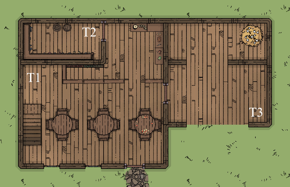 This tavern is meticulously ordered; each table has four seats; the stools are perfectly spaced at the bar front and the shelves along the back wall have glassware ordered in size. The tavern will be regularly frequented by the denizens and will usually be half full, even through the night. Many of the denizens will simply sit at the tables having (very) idle conversation with one another. Some will play cards, but if watched, it will become clear they are simply randomly placing, shuffling and moving cards around on the table with no recognisable order. The denizens can eat and drink, but only a small amount.
