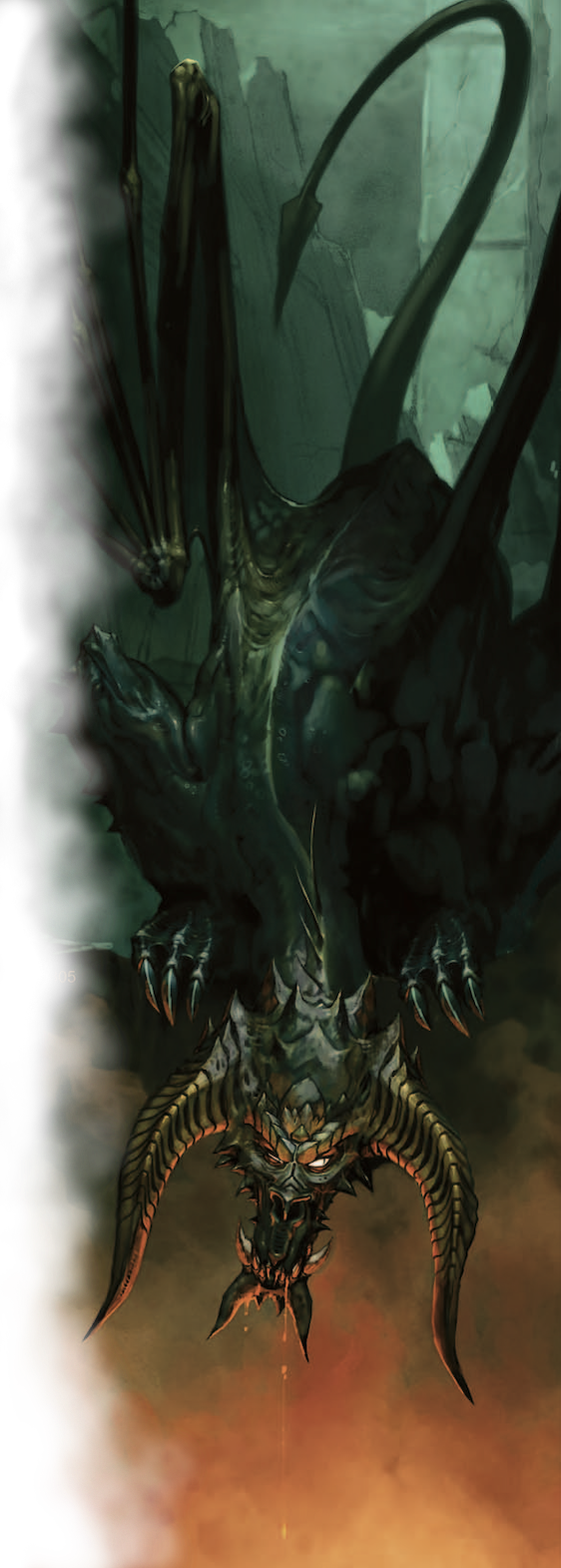 The portal opens, scaring any nearby creatures aside from the party. From it appears a huge gargoyle-like creature, with a muscular frame and great ebony wings. He is covered in pale blue hair growing from gray skin and has a long tail. As he squeezes his body through the portal, he stares down the adventurers and in a low grumbling voice "Free Me!"