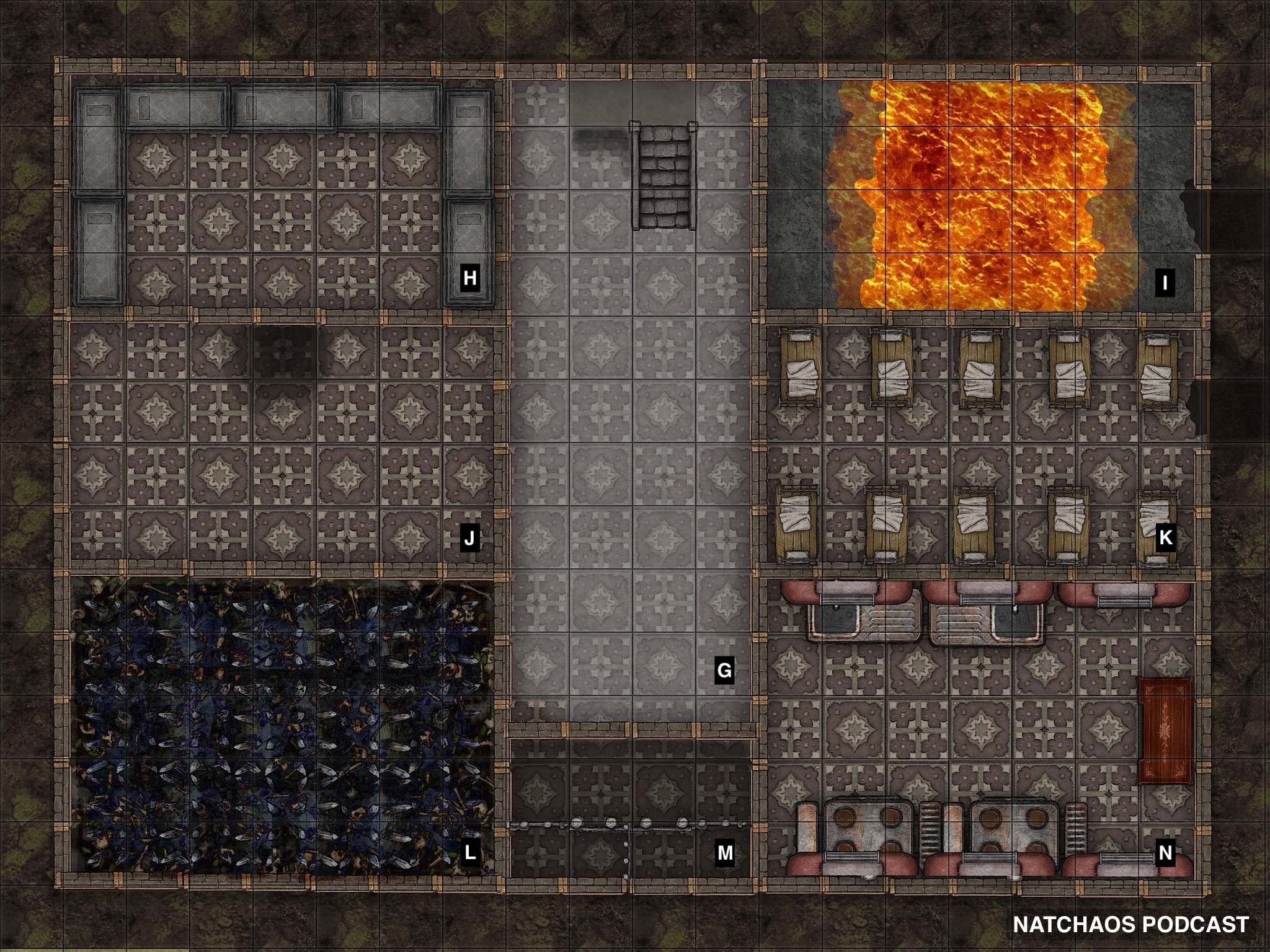 The lava pit is a 35 by 20 feet room. On each side is a stone ledge about 5 feet wide. The rest of the room is just lava that deals 10d10 fire damage per round while not submerged. There is a door to room G which can be opened from the inside, but it is locked from outside. There is also a tunnel going from room I to room K. Finally, there are trap doors that lead to room F but they require the creature to reach the ceiling and make a DC12 Sleight of Hand check to open.