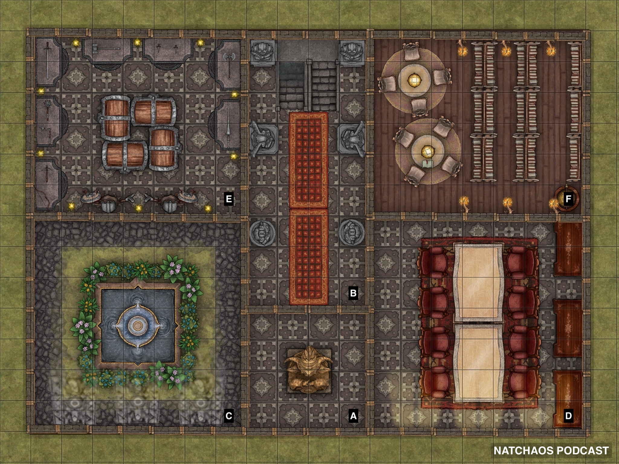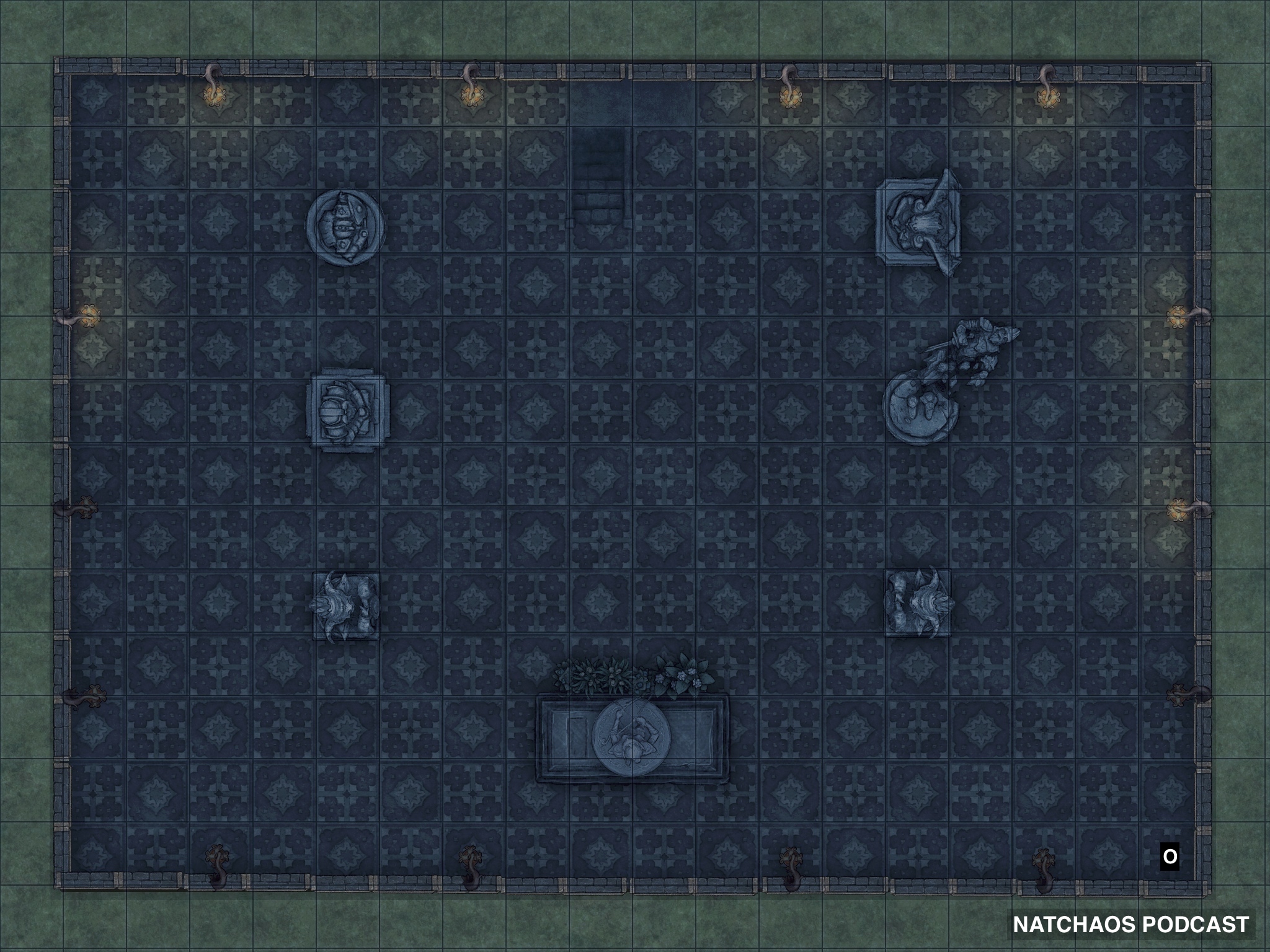 Once they are able to enter the room, the party will notice that the part of the room close to the stairs is the only part that's lit, albeit dimly. From their location, they can see six statues, one of which has been broken. On the ceiling are rows of ceiling banners, forming large waves or hills. Towards the far end of the room are shadows. A DC12 Perception check reveals a statue of a lady holding a staff. She stands on top of a stone block, in front of which are several bouquets of flowers.