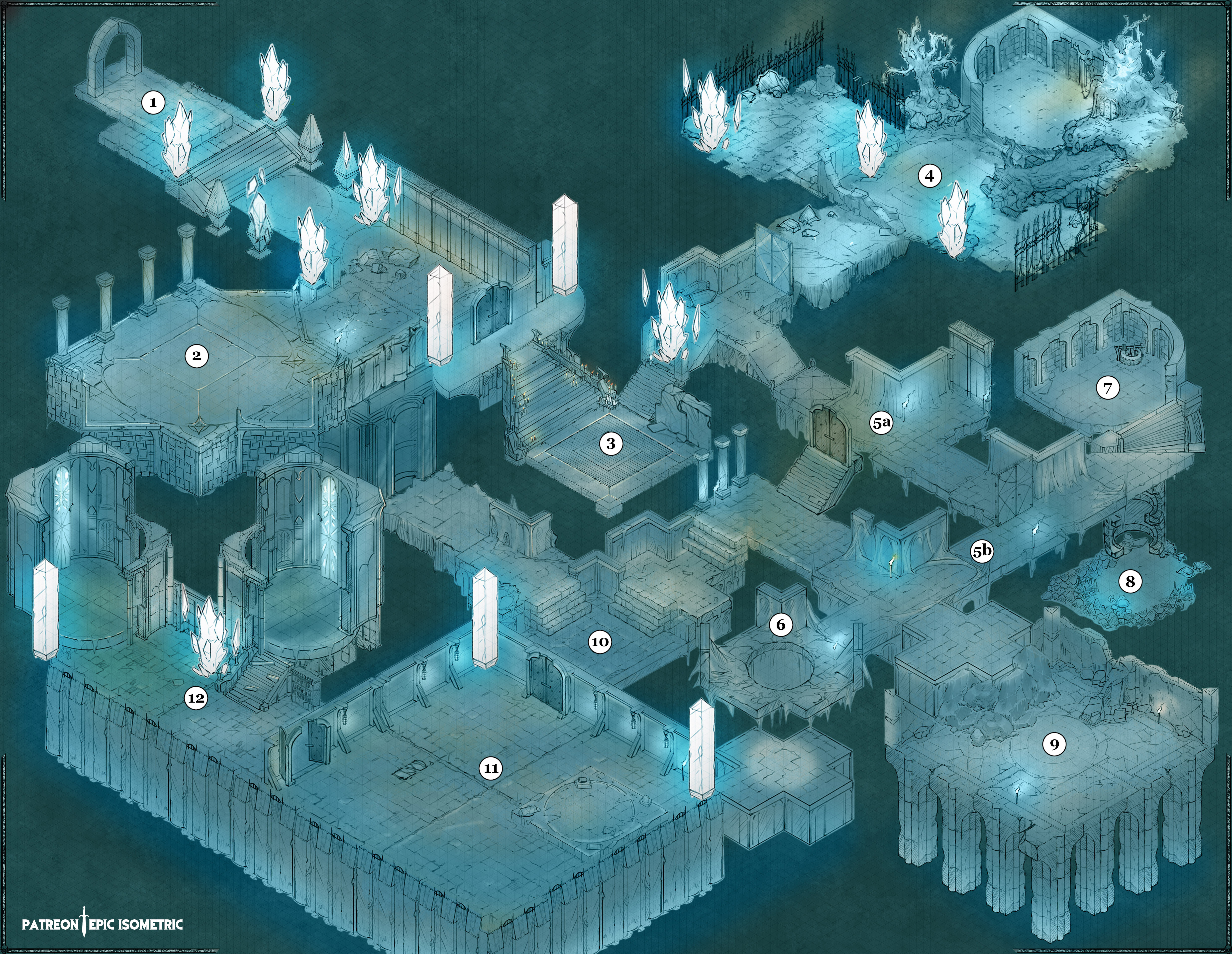 There are two main entrances to the tomb, the entrance hall (Area 1) or the ruins (Area 4). Both are clearly visible from the other due to the glowing crystals so characters can choose which they begin to explore first.