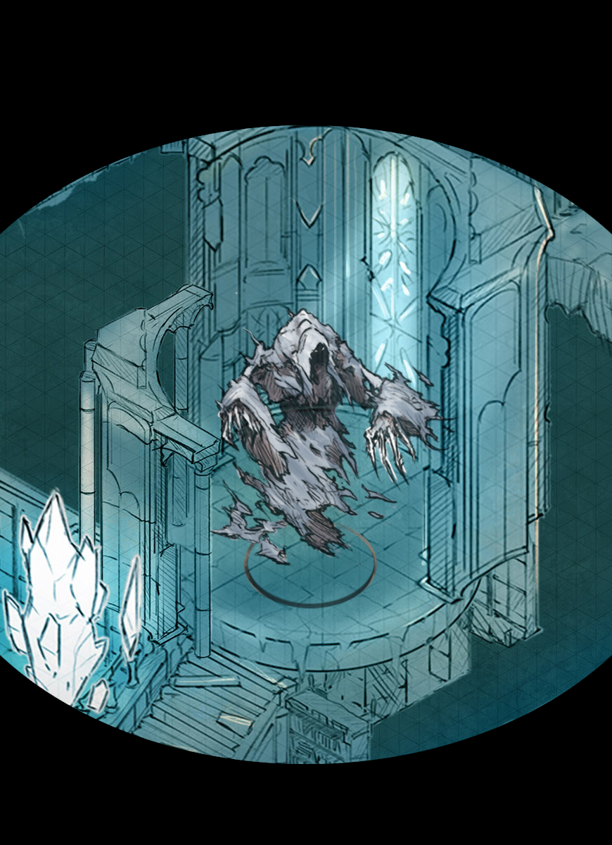 Undead Guard - A skeletal undead warrior stands in the middle of the circle. She wielding a sword which looks like it was carved from one of the ethereal crystals. When any character approaches this room, she shouts a warning to leave this place and not to return.