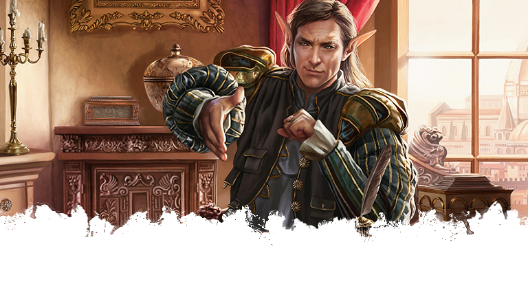 Hands steepled, resting on an extravagent table a gaunt half-elf discusses the terms of trade with his new partner, his eagerness hidden behind a stony-faced facade.