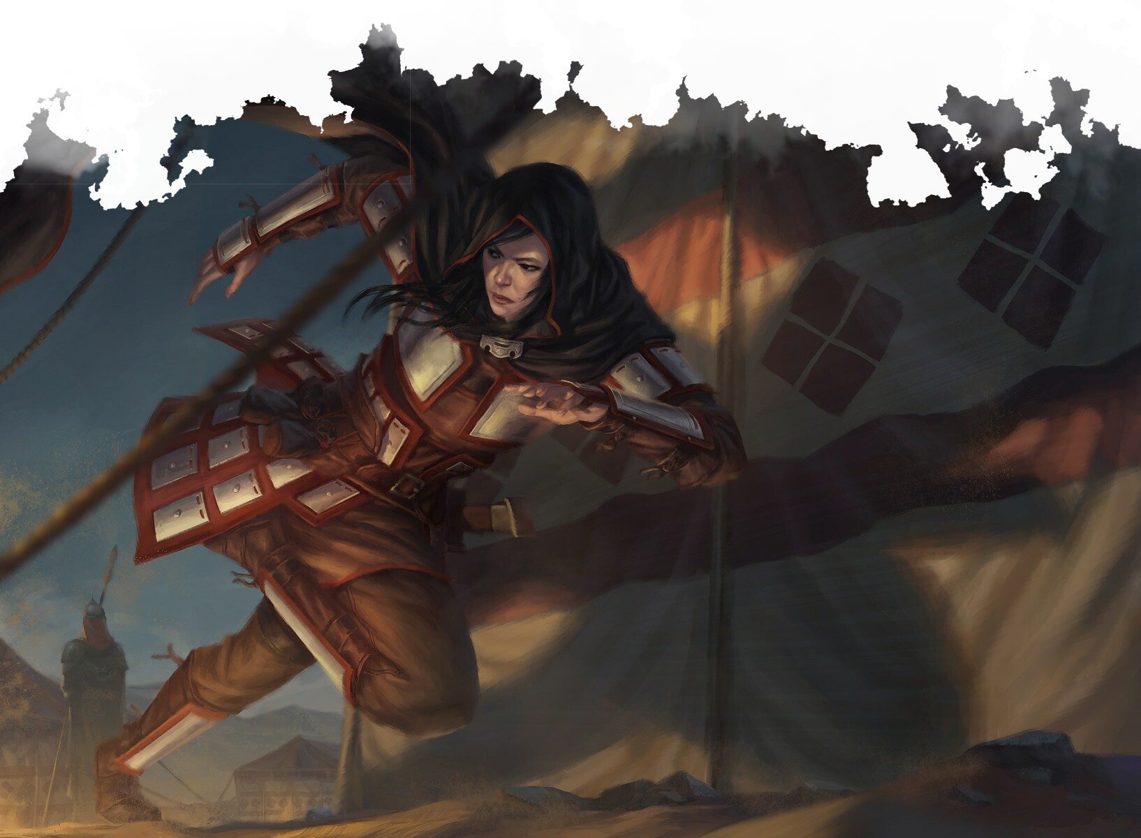 A human lurks in the shadows of an alley while his accomplice prepares for her part in the ambush. When their target — a notorious slaver — passes the alleyway, the accomplice cries out, the slaver comes to investigate, and the assassin’s blade cuts his throat before he can make a sound.