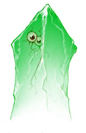 The throne is made of chiseled stone, with lidless eyes and gaping mouths etched into it. Wizzy approaches the throne and gets splashed by the green slime falling from