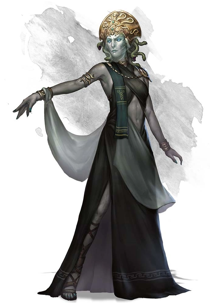We move back towards the fork in the path and notice that one of the caves appears to have a snake-like trail leading into it. We have Banshee's unseen servant move ahead of us and confirm that the medusa is inside this cave. We light some zurkhwood on fire in an attempt to smoke her out. Once enough smoke has filled the cave, she rushes out and begins to attack us. The medusa appears to be a female drow with snakes for hair.
