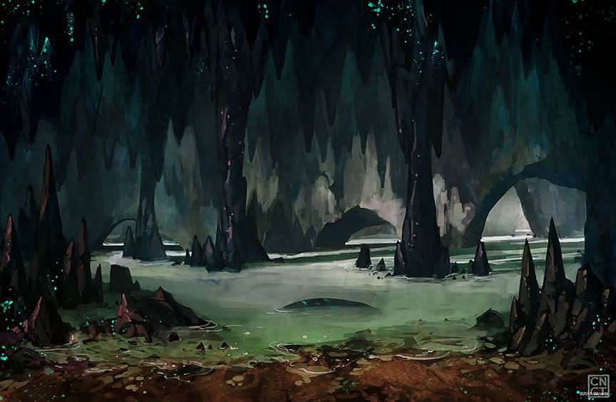 As we continue to move along the water, the ceiling drastically lowers. Taller members of the party need to lower their heads. The area is illuminated by bioluminescent fungi. The smaller members on the boat notice a large, jagged gash in the ceiling (giant chunks of rock missing as well). Wizzy investigates the ceiling and can tell that the rock is very difficult to disfigure and would have had to be done by magical means.