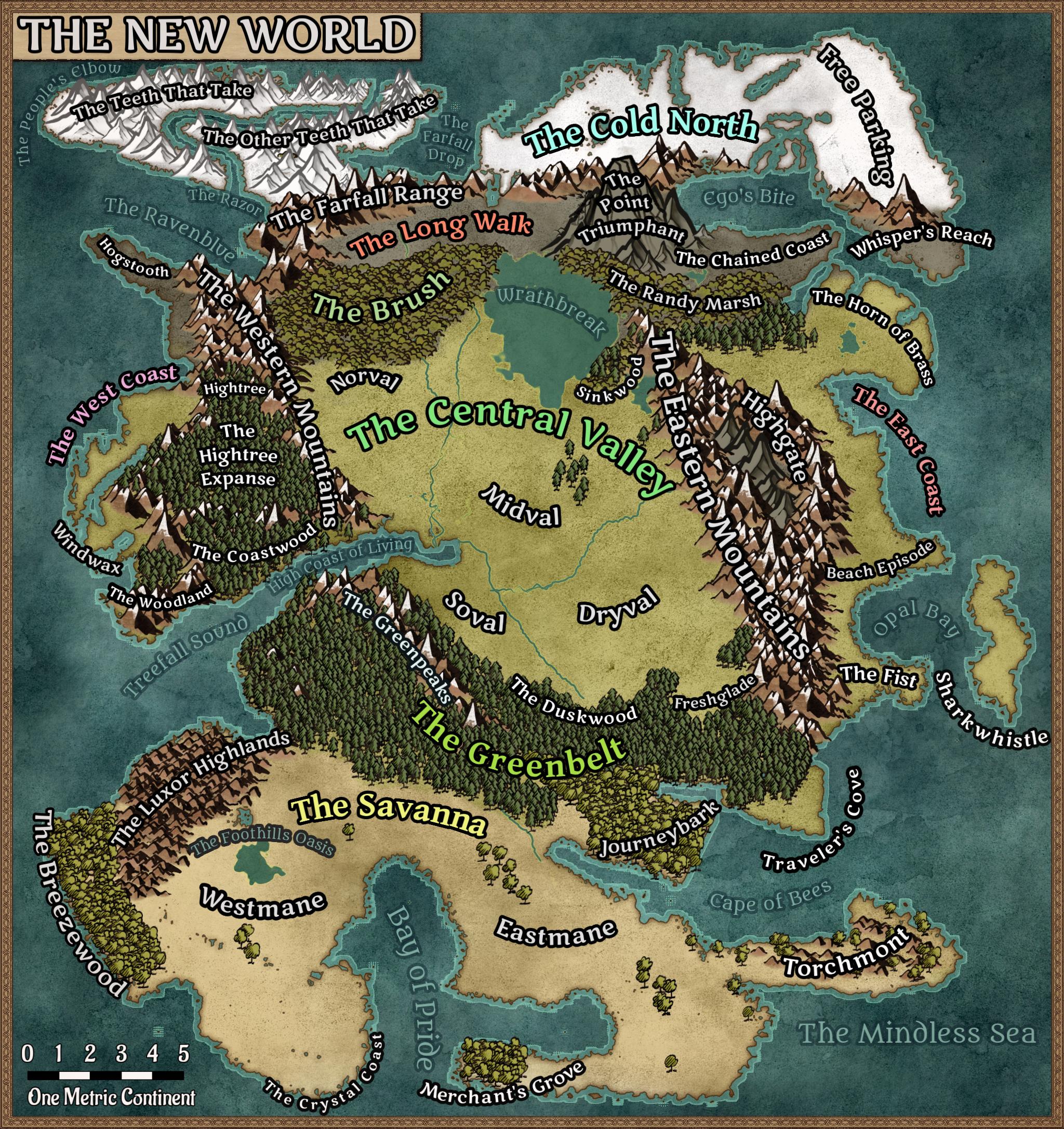 Humans are the most populous race in the New World and by far the most politically powerful. All of their settlements feature a variety of races, with halflings and half-dwarves making up a staggering percentage of the non-human population. Human realms are found between the frozen north and the warm south.