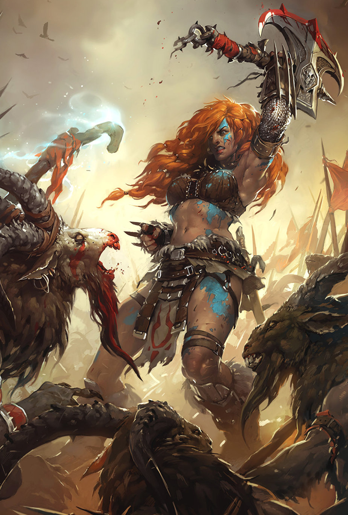 A half-orc snarls at the latest challenger to her authority over their savage tribe, ready to break his neck with her bare hands as she did to the last six rivals.