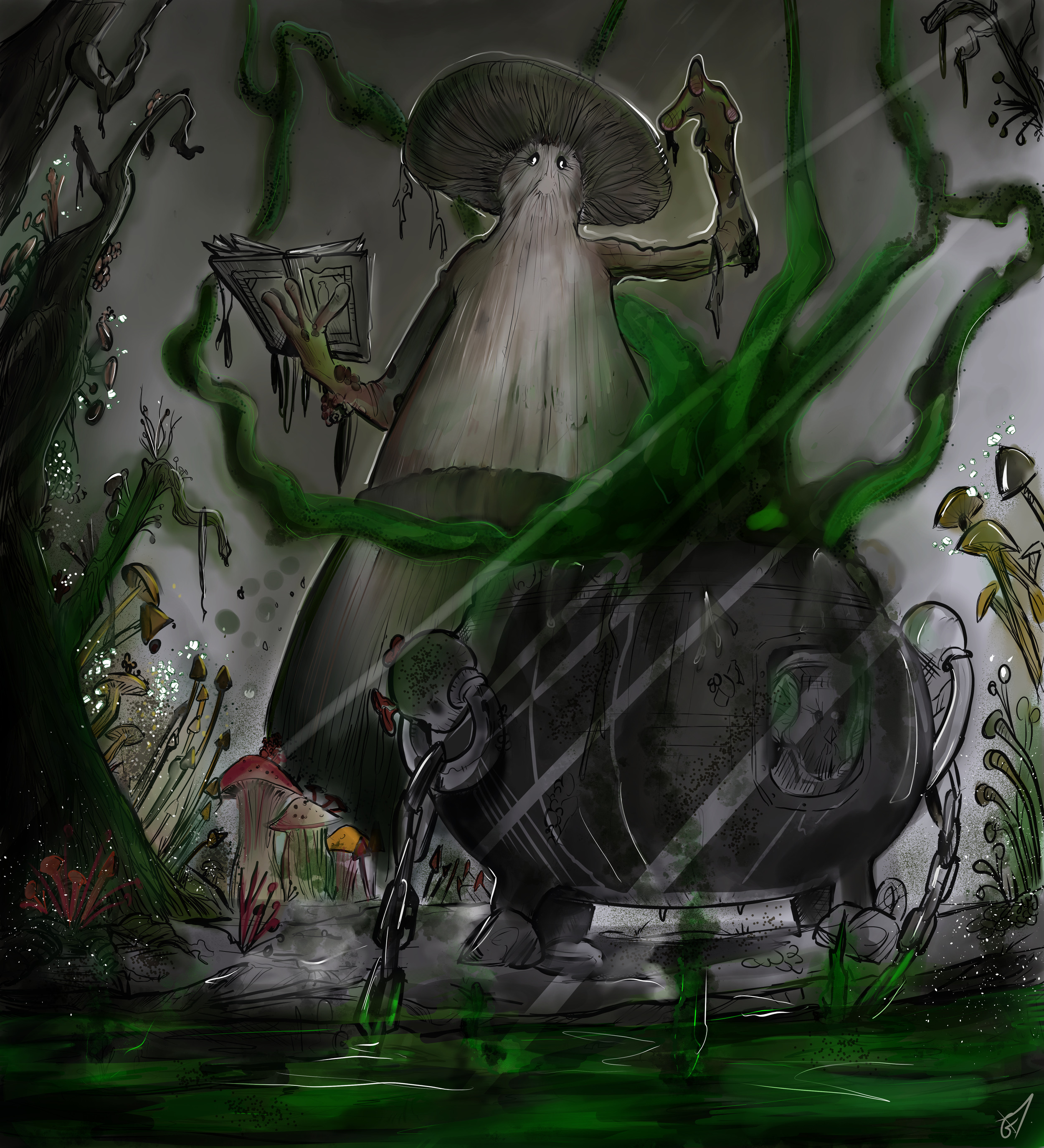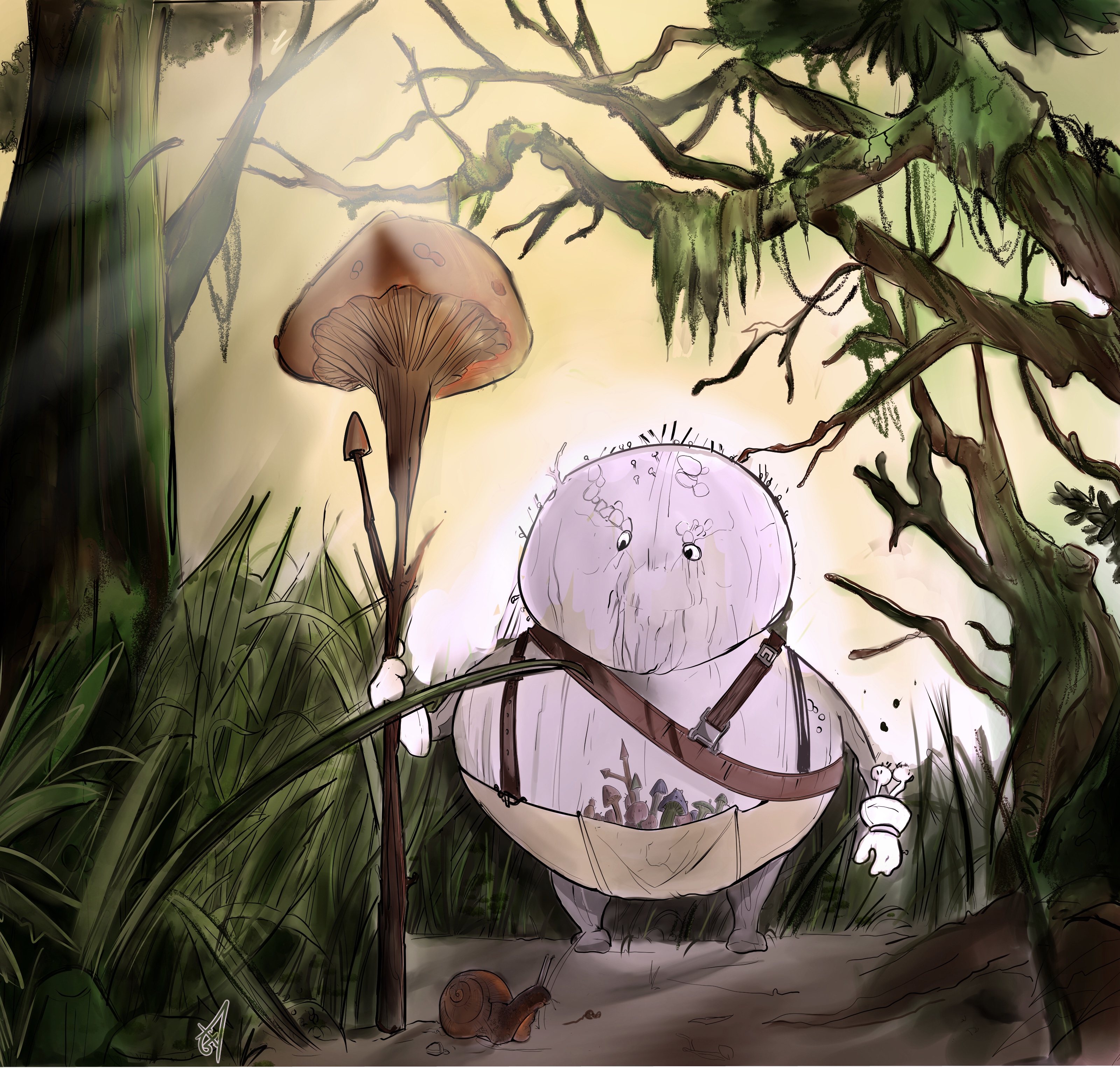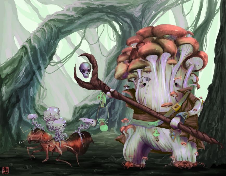 I sit in the local tavern in a private room I have reserved for this interview. The "Kingo" as they call themselves are a new and unusual race that have recently cropped up across the world and wandered into populated areas, with questions mounting and people wanting to know more about these strange new creatures I’ve taken it upon myself to catalog and observe them in order to truly understand what they are. Luckliy for me i had an artificer friend of mine whip up something to help me on my endevours. I call it the auto-scribe and it connects to me magicly and auto-matticly writes down my thoughts and observations so i am free to do other things.I wait around for what seems like an eternity before it arrives, a huge hulking mushroom covered in large pustules’ and a rippling muscle like body towers over me at around 6 foot 5. Its menacing aura and large demeanor is quite shocking and off putting. "Hello" I say "Thank you for meeting with me today, my name is Chris and I’m an Ethnologist studying your people." It looks at me with its pupil-less eyes dark as the void, and says nothing, but gestures with its hands as if it’s taking something from the top of its cap and sprinkling it over me and making a taking mouth with its hand. "You can only speak to me if you use your spores?" I ask studying the face of this creature. It nods excitedly. "Go ahead and spore me then" I say hesitantly and watch as a thin could of spores flows from the Kingo as if a thin fog rolling over a field in the early morning, as it reaches me I can hear a quiet voice slowly gain volume and strength as the spores wash over me. "Hello! Me Kingo!" says the voice in my mind. The voice reminds me of a young child but echoes and reverbs slightly as if its multiple voices coming together to form one. "Hello Kingo nice to meet you, was your trip here okay?" As I ask this I can feel a slight pain in my arm almost like a ghost is nibbling on me. "Kingo trip okay! Kingo met some new friends and even got to eat something!" "That’s great!" I respond "What did you get to eat? I know of several good pastries and-" "Goblin!" says the Kingo cutting me off. "Goblin?" I ask "Goblin taste good! But put up good fight" exclaims the Kingo and pulls down its sleeve to reveal part of its forearm is missing as if the goblin also got to taste some of the Kingo. "Oh my gods! Do you need a doctor or a healing potion I have so-" Kingo holds it hand up and giggles "Kingo no need doctor or red juice all Kingo need is food." And reaches for the small spread of wine, water and some Hors d'oeuvres I have on a small table it grabs a small sandwich, I watch as it brings the sandwich to its face and rubs it around approximately where its mouth should be while saying "om nom nom nom nom." I watch with Astonishment as the sandwich falls apart from the force of the rubbing as well as it get absorbed into the Kingos face and slowly as its missing flesh is regrown before my eyes. "Yummy sandwich" says the Kingo as his arm is back to normal and the phantom pain in my arm is gone. "Kingo thirst!" It exclaims and reaches for the bottle of wine. "Would you like a cup?" I ask handing it a copper goblet. It takes the goblet "Thank you! Kingo always wanted a cup" as it puts the cup in its bag and dumps the wine on its body. "The cup was for the wine… but I guess you can keep it." I can see the wine seep into its body and I can feel the slight buzz of the alcohol as if I just chugged the full bottle myself. "Is it normal for people you spored to shame stimuli and sensations?" I ask pulling out my notepad full of questions "Kingo love to share with friends! Kingo shares food and feelings!" "I appreciate it, would you like to answer some of the questions i have?" "Yes! Kingo knows many thing"