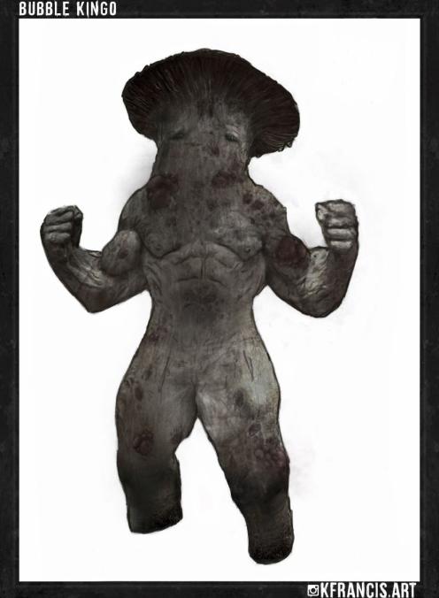 Kingos or Kingo as they call themselves are a Fungi species that come in all shapes and sizes. They can grow into the any shape as desired. People have reported seeing dogs, pigs, horses, chickens, birds and ever monsters that are just Kingos grown into that shape. However, the standard Kingo will grow into a vaguely humanoid shape with stubby legs and arms attached to a long torso that grows into the cap. It has no mouth or eyes, but it does have two bead-like “eyes” it uses to see. They can be of any color but it tends to depend on what mushroom they originated from. It breathes through pores in its skin and excretes waste products through the same means.
