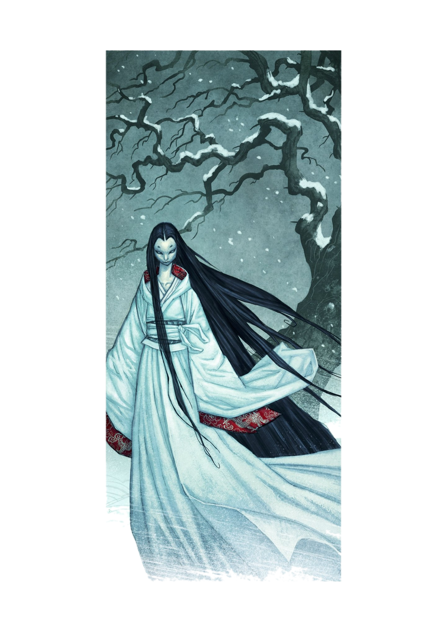 Known throughout the archipelago as the snow woman, the yuki-onna are the ghosts of blizzards and snow covered mountain tops. With skin as white as the fresh snow, and as cold as the winter, the yuki-onnas stalk lost travelers, floating above the snow as to leave no tracks.