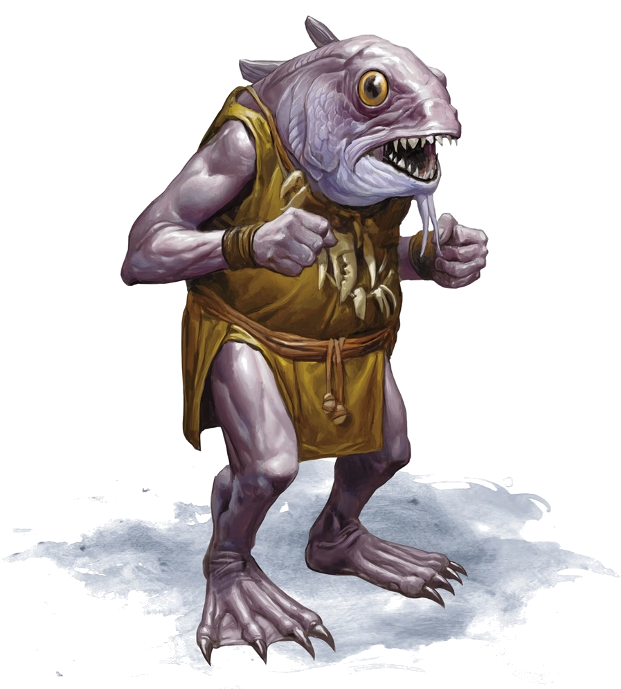 Kuo-toa, also known as gogglers and men-fish, are a debased, piscine race of warm-blooded, amphibious creatures that dwell in the Underdark. The kuo-toa are fanatics plagued by mental instability who see things others can't and worship gods that don't exist–at least until they believe hard enough.