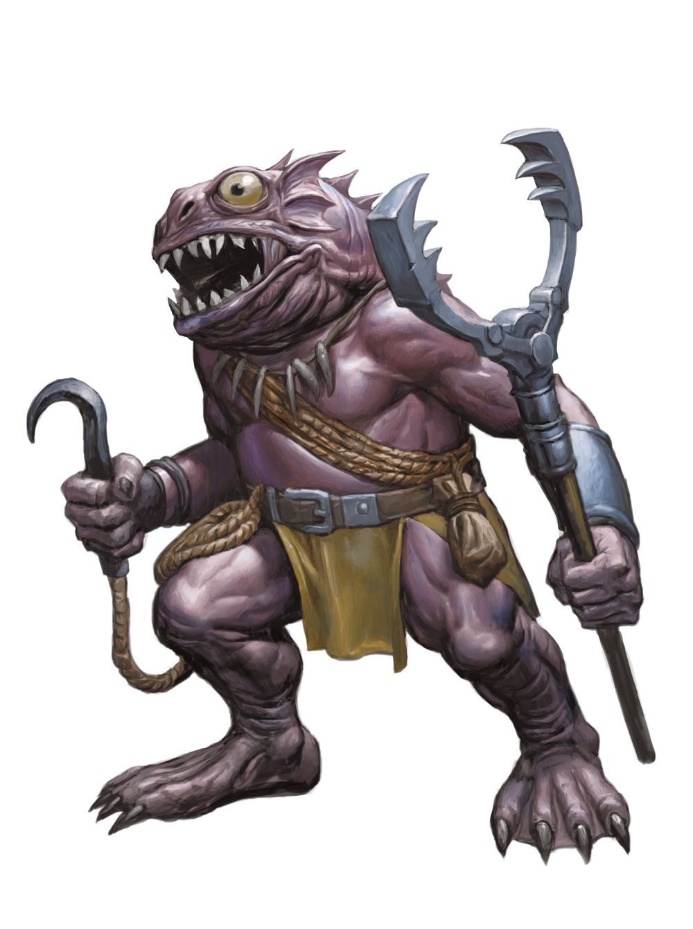Kuo-toa are normally 5 feet tall and weigh approximately 160 pounds. Contrasting with their paunchy shape are their arms and legs, slender and lithe despite their relative shortness. At the end of each limb are broad, distended and partially webbed hands and feet. Each extremity has three main digits and one opposing digit at its end. Topping their bodies are bullet-shaped, piscine heads hosting a mouthful of sharp teeth and a pair of bulging silver-black eyes capable of independently swiveling to observe a situation.