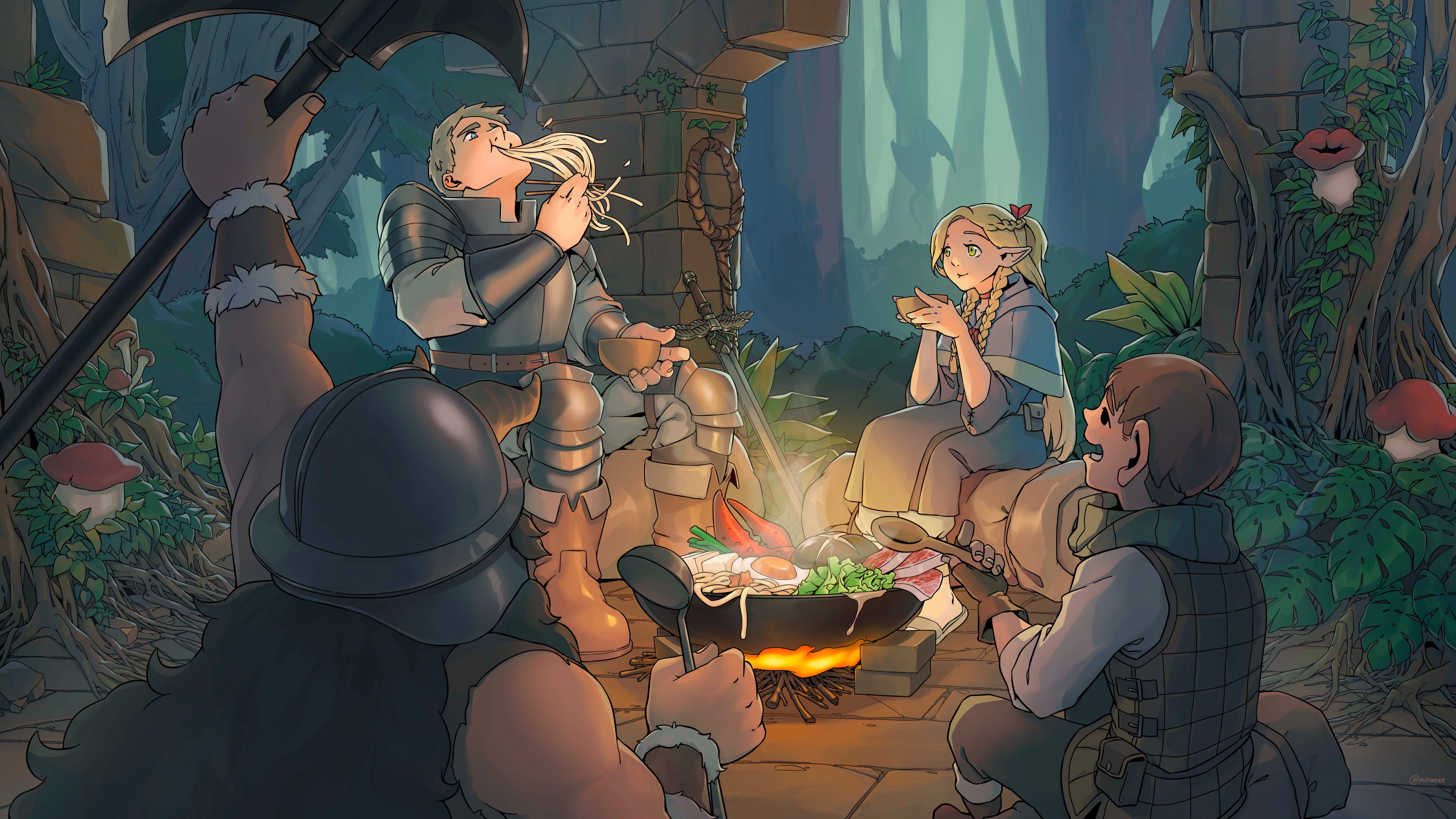 On a dim night in a clearing in the forest, a party sits around a warm, softly crackling fire. A human bard lifts the pot's iron lid, revealing a thick yellow stew with potatoes and pan-fried bacon cuts of griffon meat. As a peppery aroma wafts gently outwards, bowlfuls of the stuff are passed around, and chatter ceases as the party begins to chow.