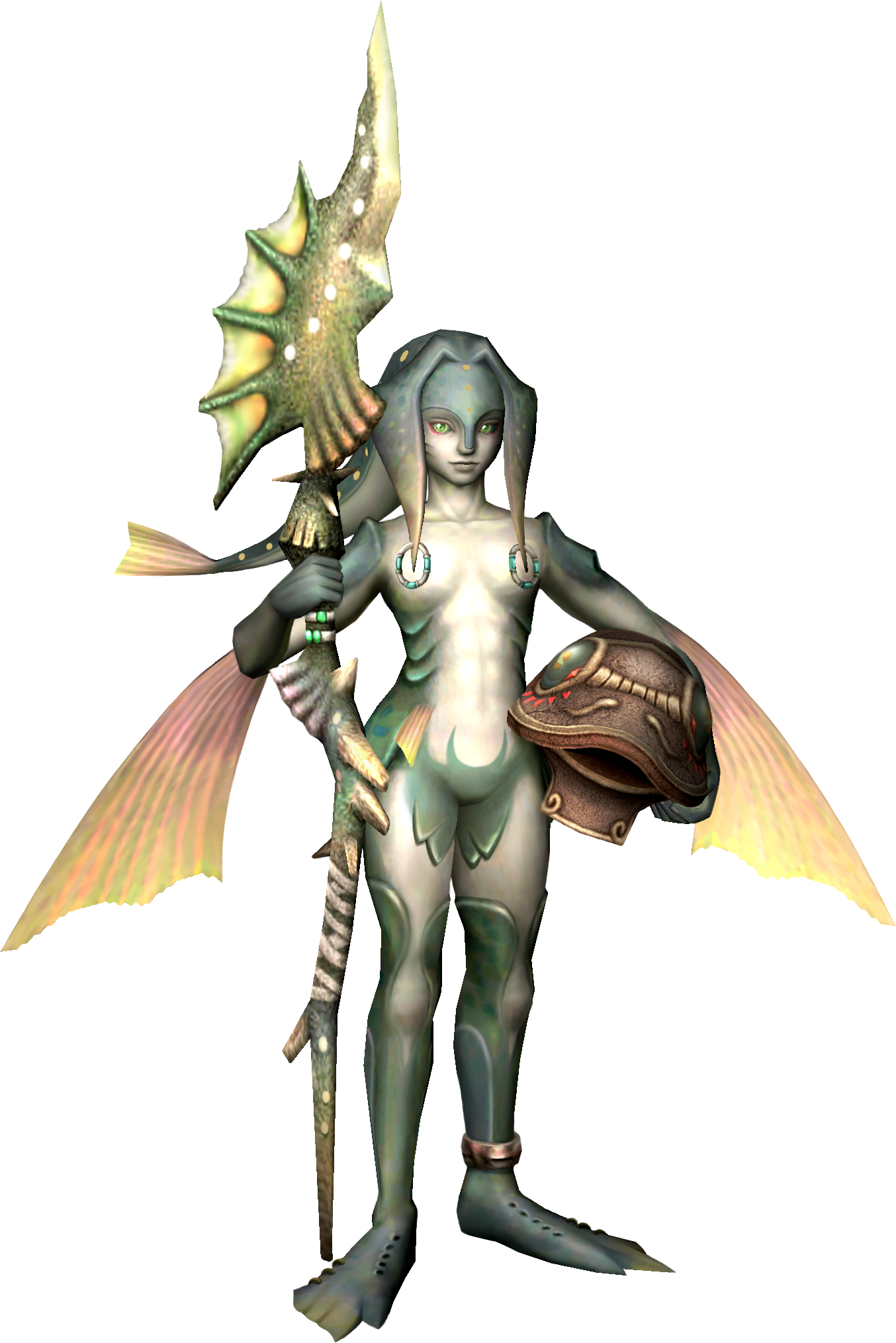 Zoras are an aquatic folk who possess fish and amphibian like traits, including fins, webbed feet and gills, which allow them to swim a\columnbreak