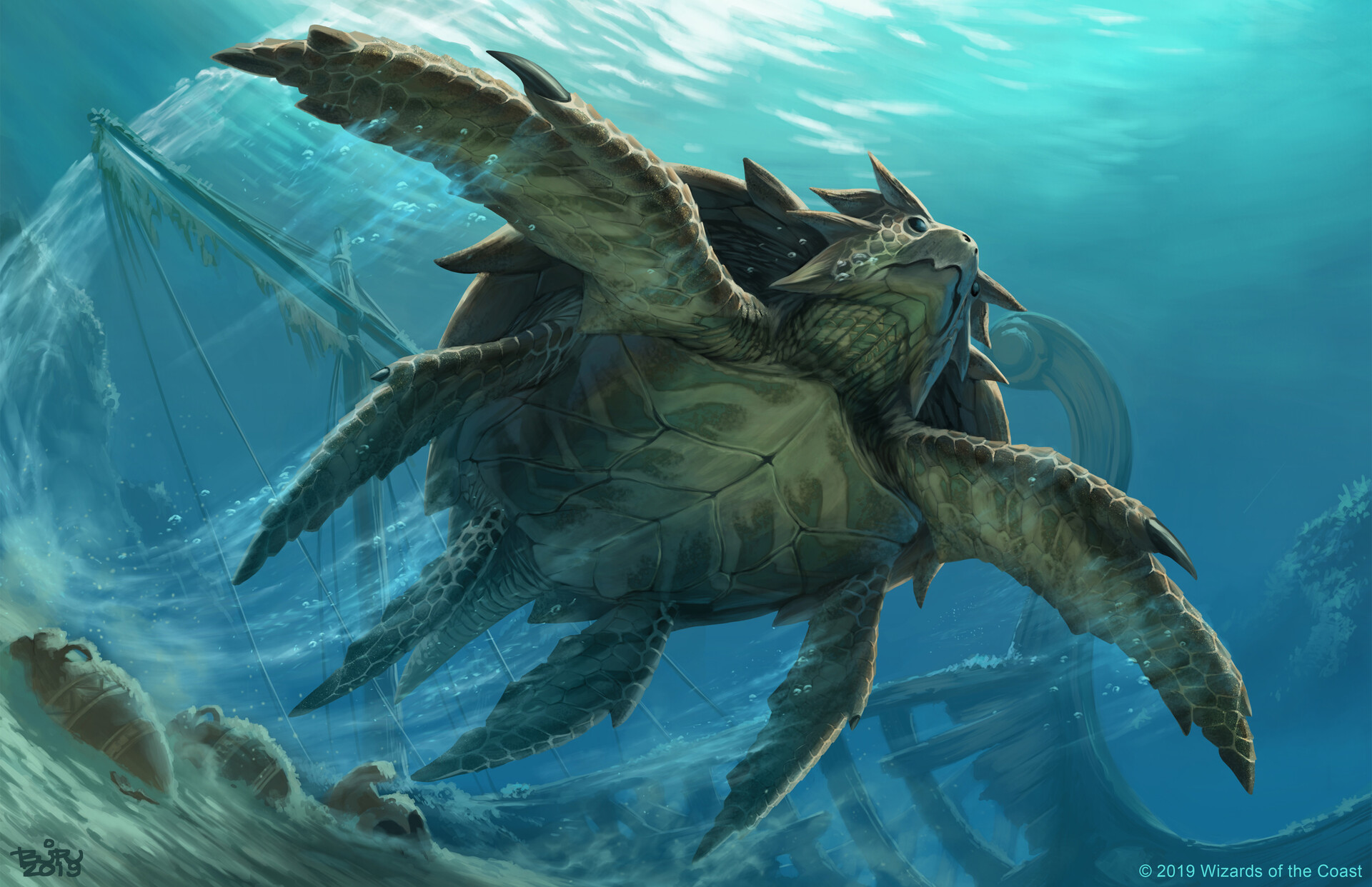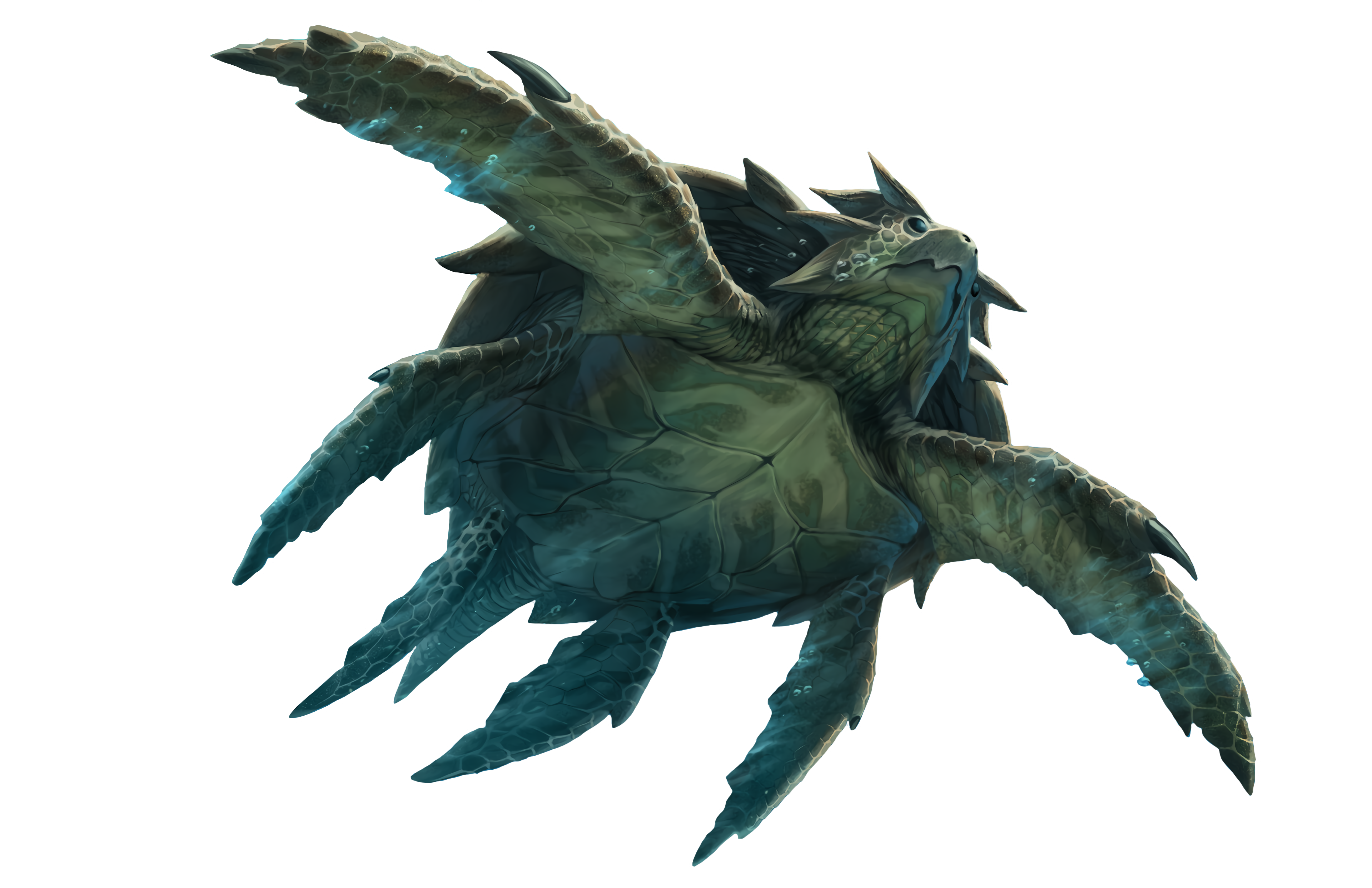 A Gentle Sight. Coastal turtles are recognisable for their six flippers, rugged shell, and aggressive, angular shape. Despite their appearance, coastal turtles are notoriously docile. Sea elves have learned to use these creatures as a means of transportation, hitching a ride on their shells to take them through the various currents in the shoals.