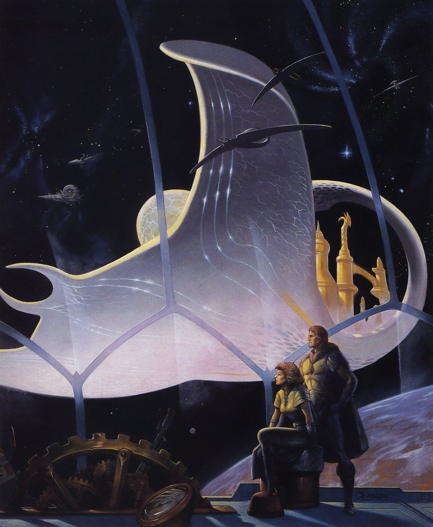 Gossamers are the spacefaring cousins of the jellyfish. They travel in groups known as shoals. Gossamers usually drift among the rocks of asteroid fields and the junk of space sargassos, though they occasionally venture into open space. They scavenge leftover prey, cleaning areas of organic junk.