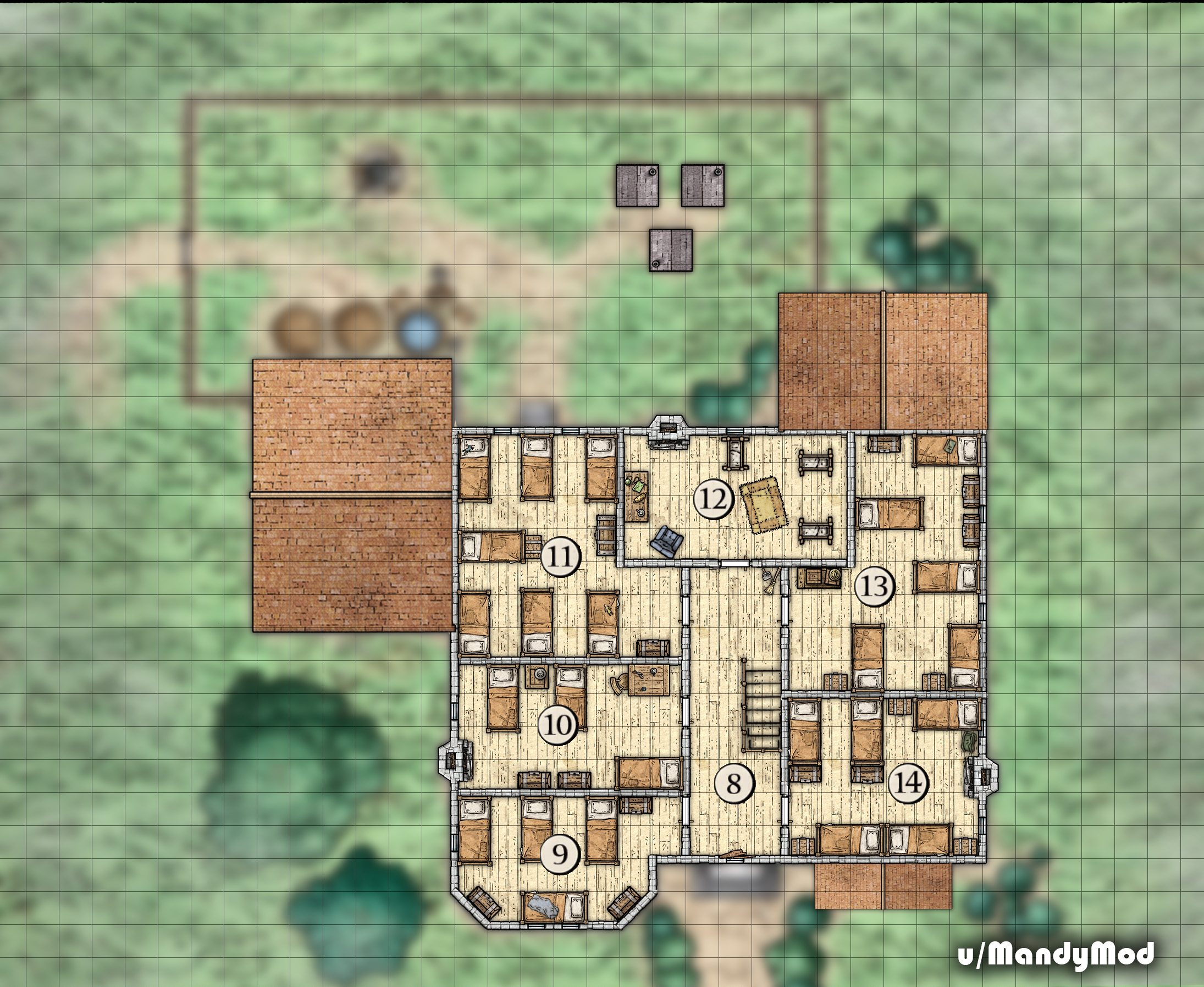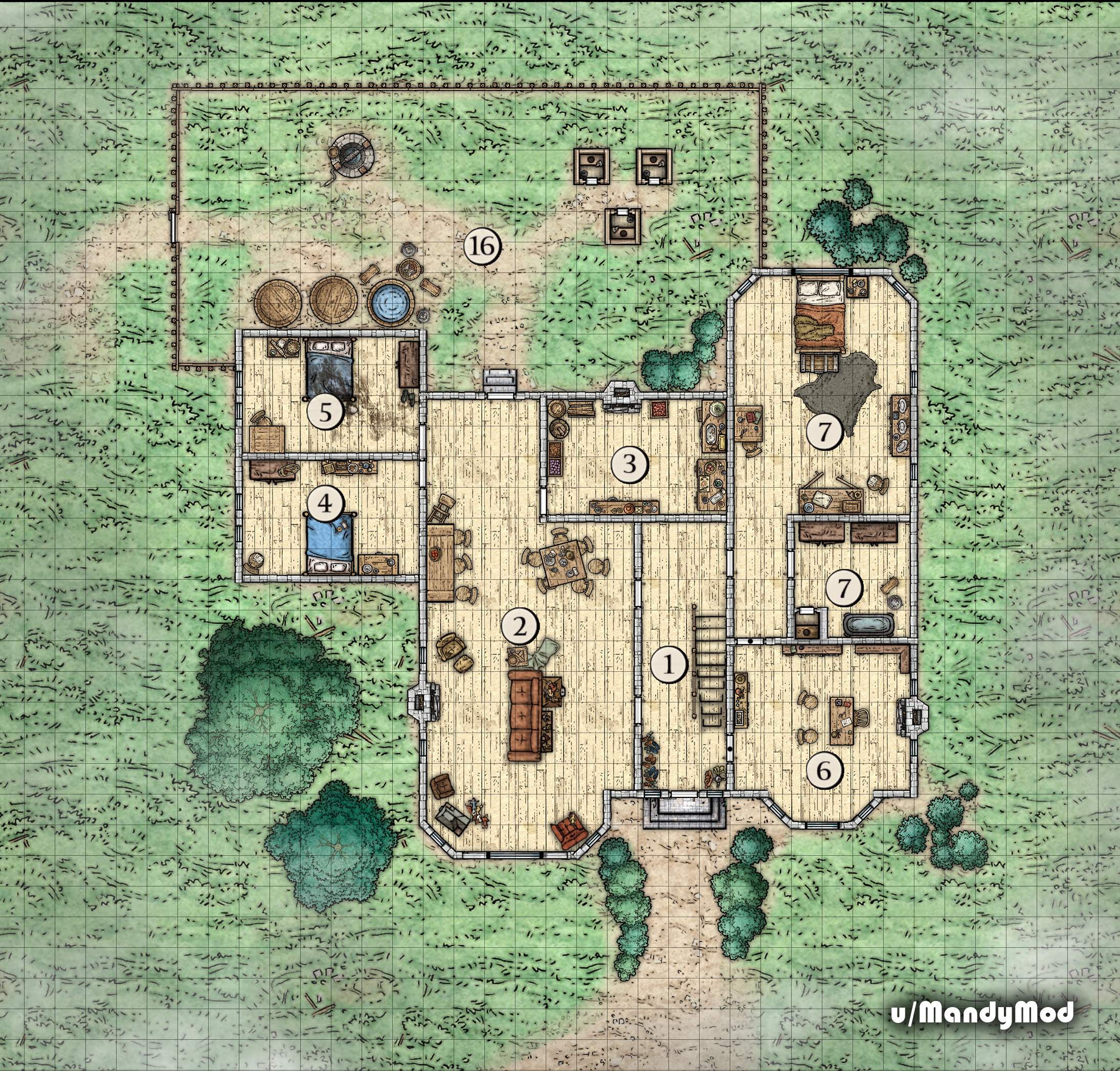 Moi, MandyMod, j'ai créé toutes les cartes de cette aventure en utilisant Adobe Photoshop et le kit de ressources de Mike Schley. Vous trouverez les cartes, en version DM et Player Friendly, sur imgur : ICI