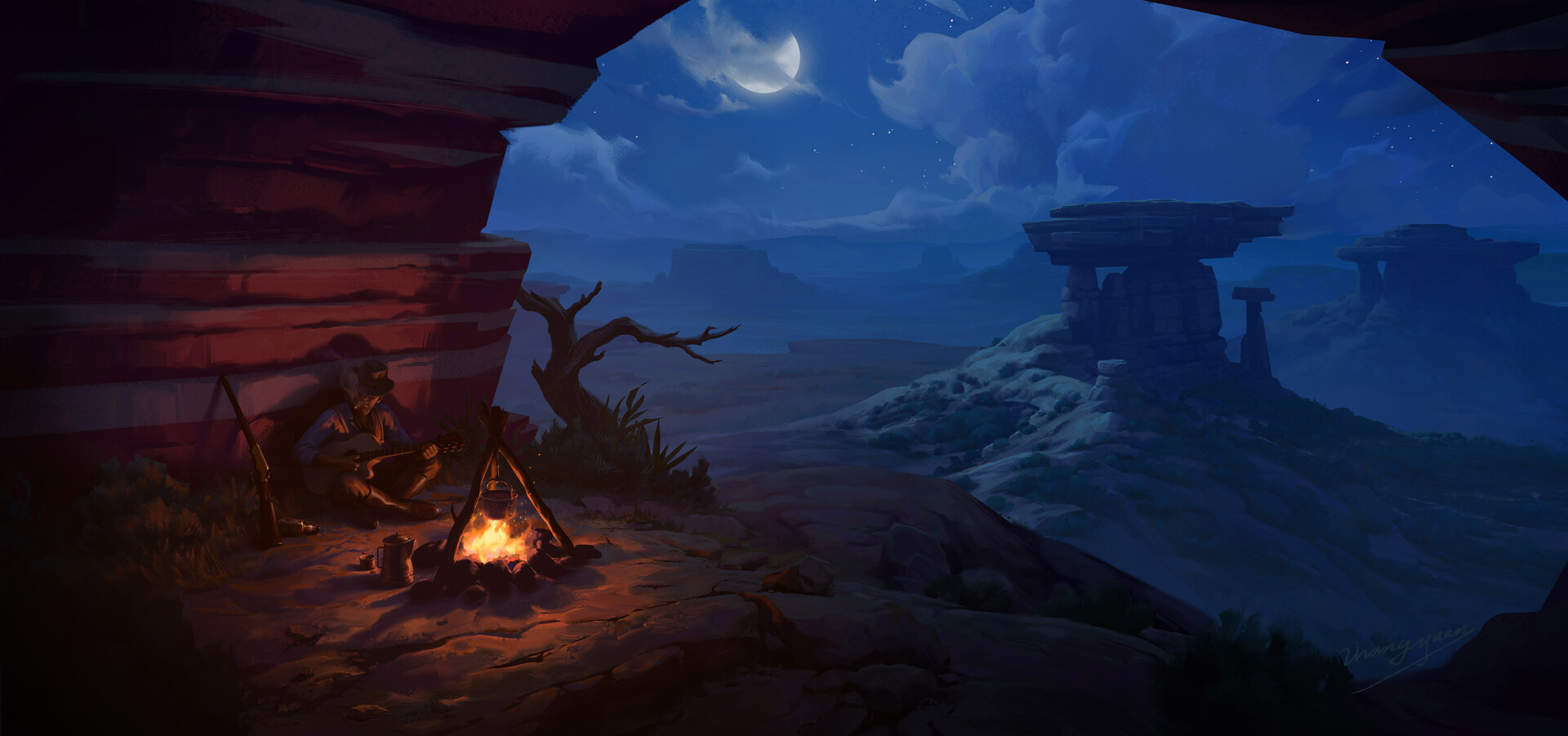 A tiefling sits over a campfire with her companions. Sitting atop the campfire she has a cauldron which she is slowly stirring and adding ingredients to. As she waits for it to boil, she etches runes into her rifle.