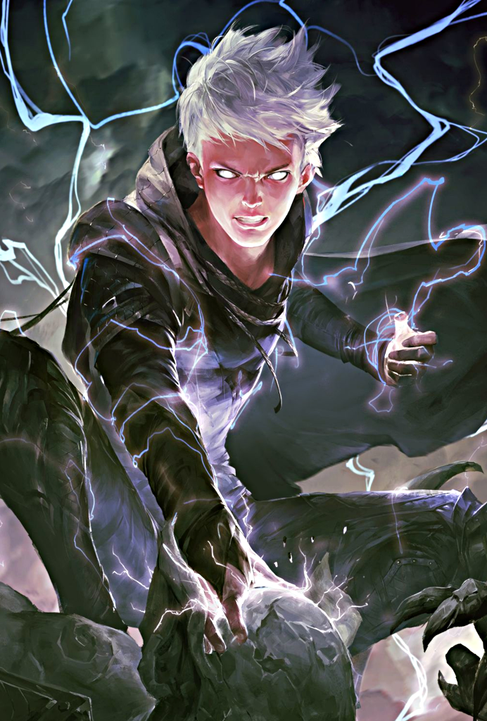 Long hair whipped by a conjured wind, a half-elf spreads his arms wide and throws his head back. Lifting him momentarily off the ground, a wave of magic surges up in him, through him, and out from him in a mighty blast of lightning.