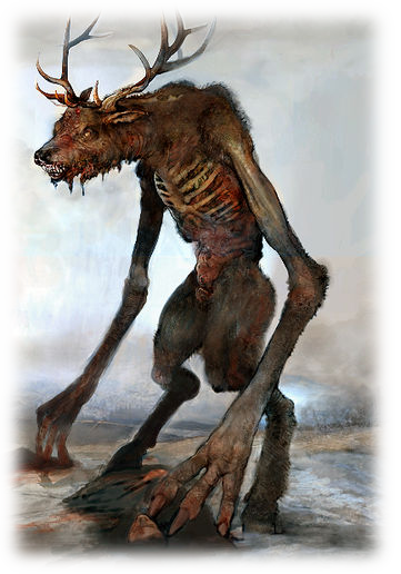 A wendigo is a creature supernaturally cursed with a ravenous hunger for the flesh of intelligent beings. It especially prefers feeding on members of the race it once belonged to - usually Humans. The wendigo's foul appearance reflects the depravity of its soul, having turned to cannibalism during its wretched former life.