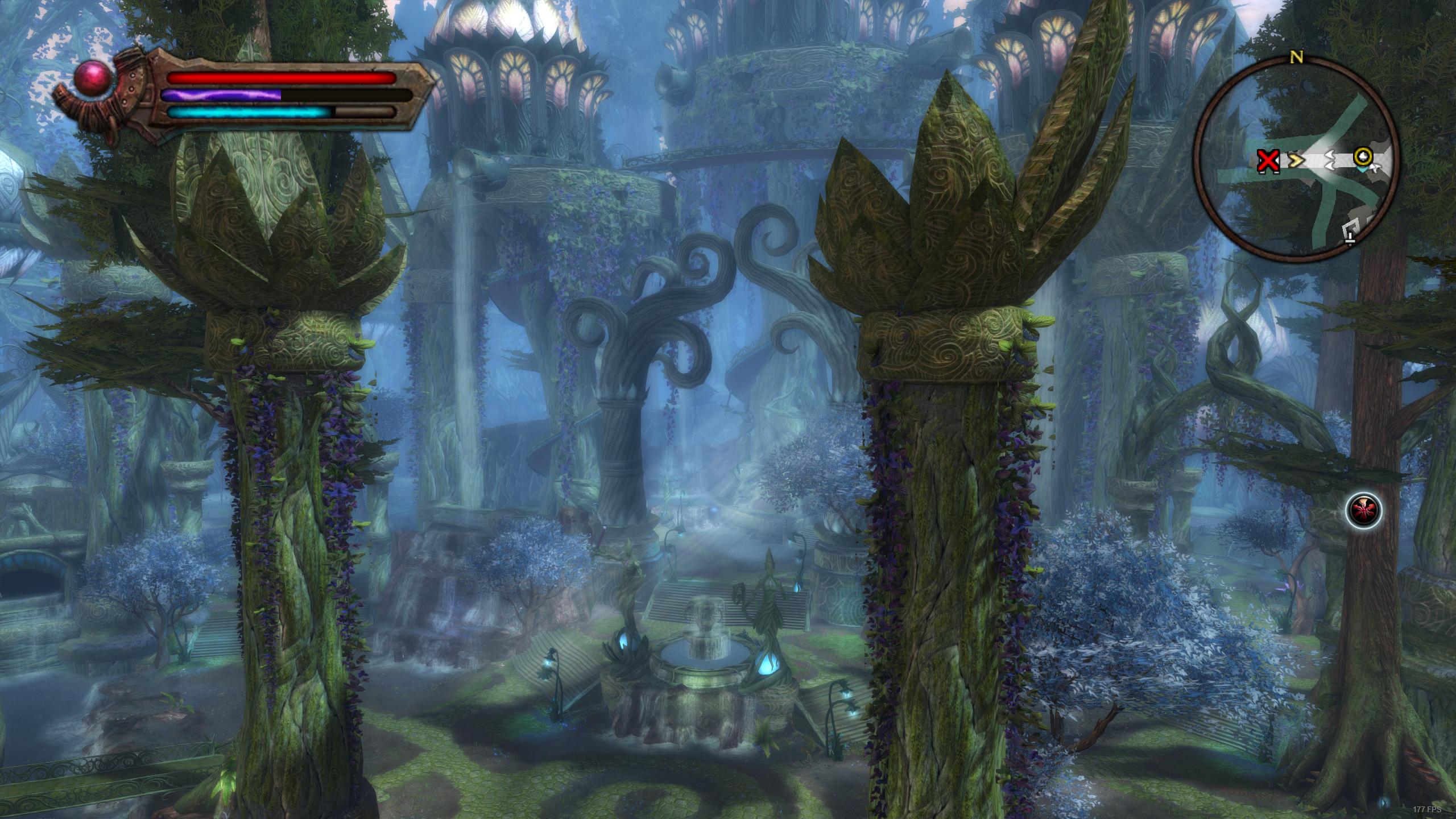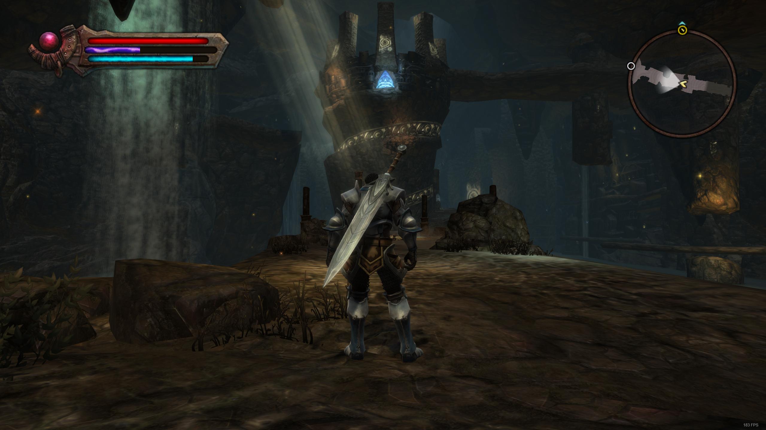 On the other side of a large wall of fallen stone and rubble, there is an enormous multi-story stone column, adorned with gnomish stained-glass at each tier commands the center of the room. Inside the mighty structure is a smaller but still grand floating transparent pillar with blue magical light swarming around the inside, and a column of brewing green energy shooting forever upward into the distant ceiling of the grand cavern. This is clearly the Well of Souls.