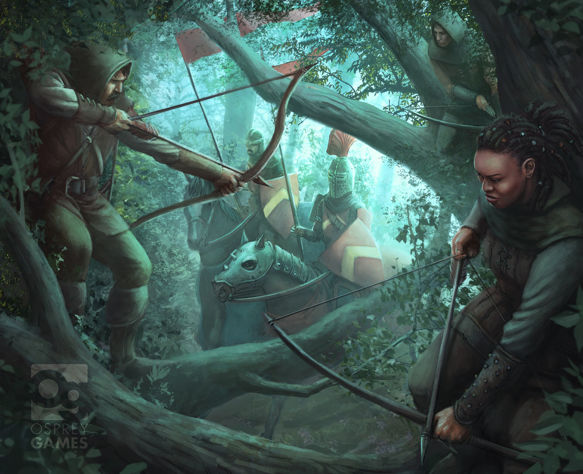 A human in clanging plate armor holds her shield before her as she runs toward the massed goblins. An elf behind her, clad in studded leather armor, peppers the goblins with arrows loosed from his exquisite bow. The half-orc nearby shouts orders, helping the two combatants coordinate their assault to the best advantage.