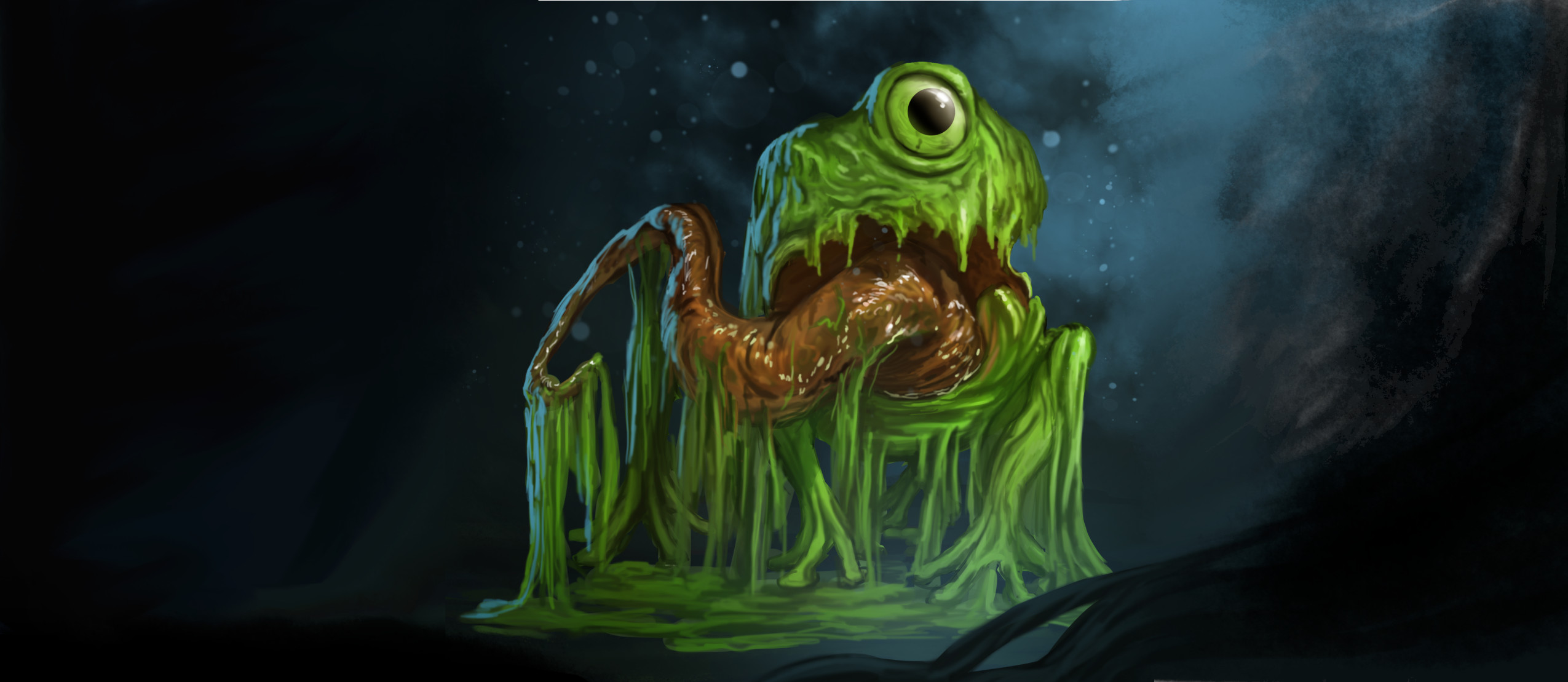 Grimes are gross, sticky oozes that hide amongst hordes of rusted loot that have stuck to them. Unlike most, these oozes are not acidic & do not break these items down; instead they can carry these objects both as camoflauge & as a means of protecting themselves, creating a strange shell of various metal or wooden objects.