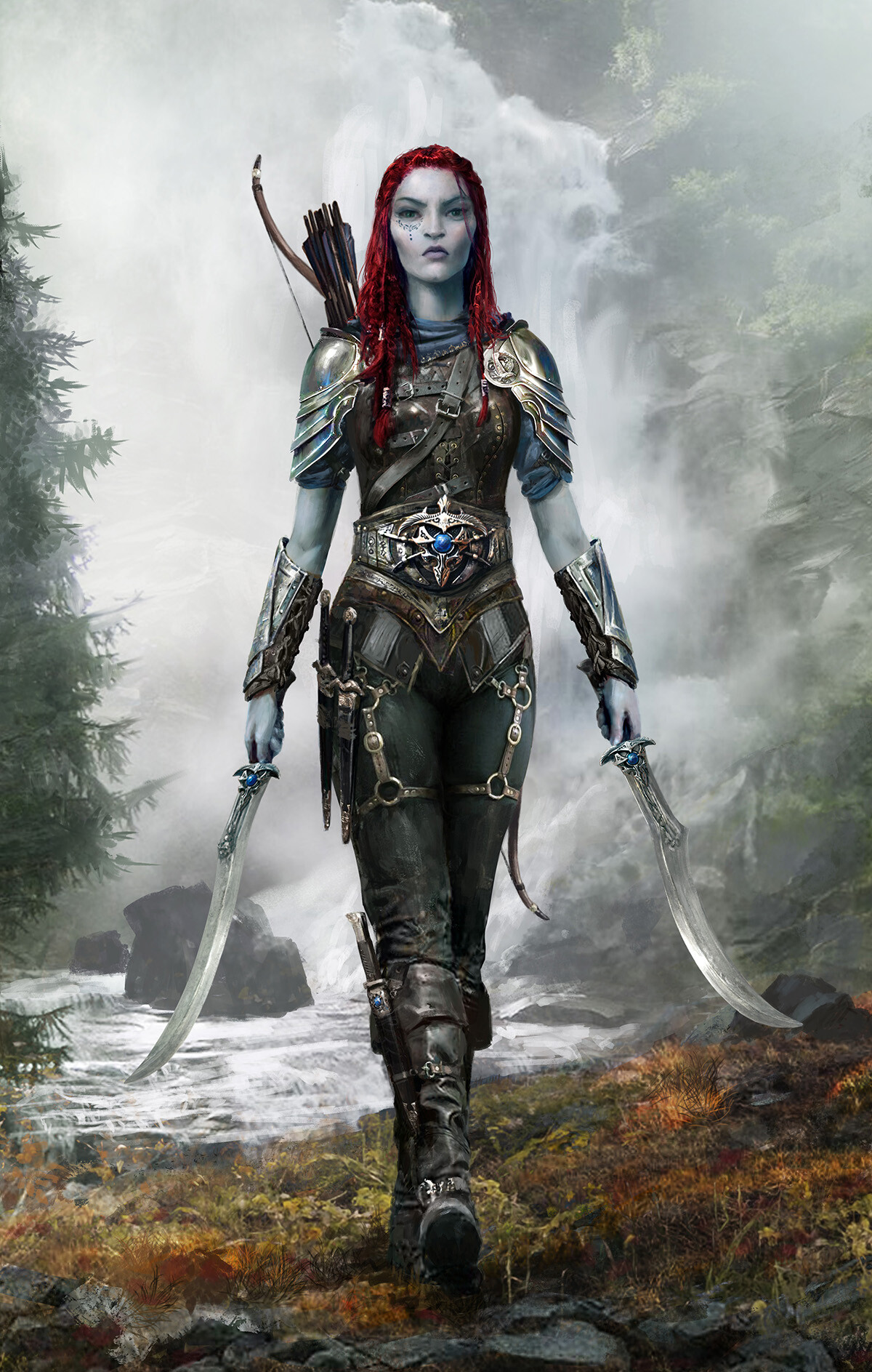 Rough and wild looking, a human stalks alone through the shadows of trees, hunting the orcs he knows are planning a raid on a nearby farm. Clutching a shortsword in each hand, he mutters an incantation as he becomes vivified with mystic speed. He becomes a whirlwind of steel, cutting down one enemy after another. Taking the leader's personal talisman as a token of his acheivement, he returns to the border city in order to claim his reward before looking for his next job.