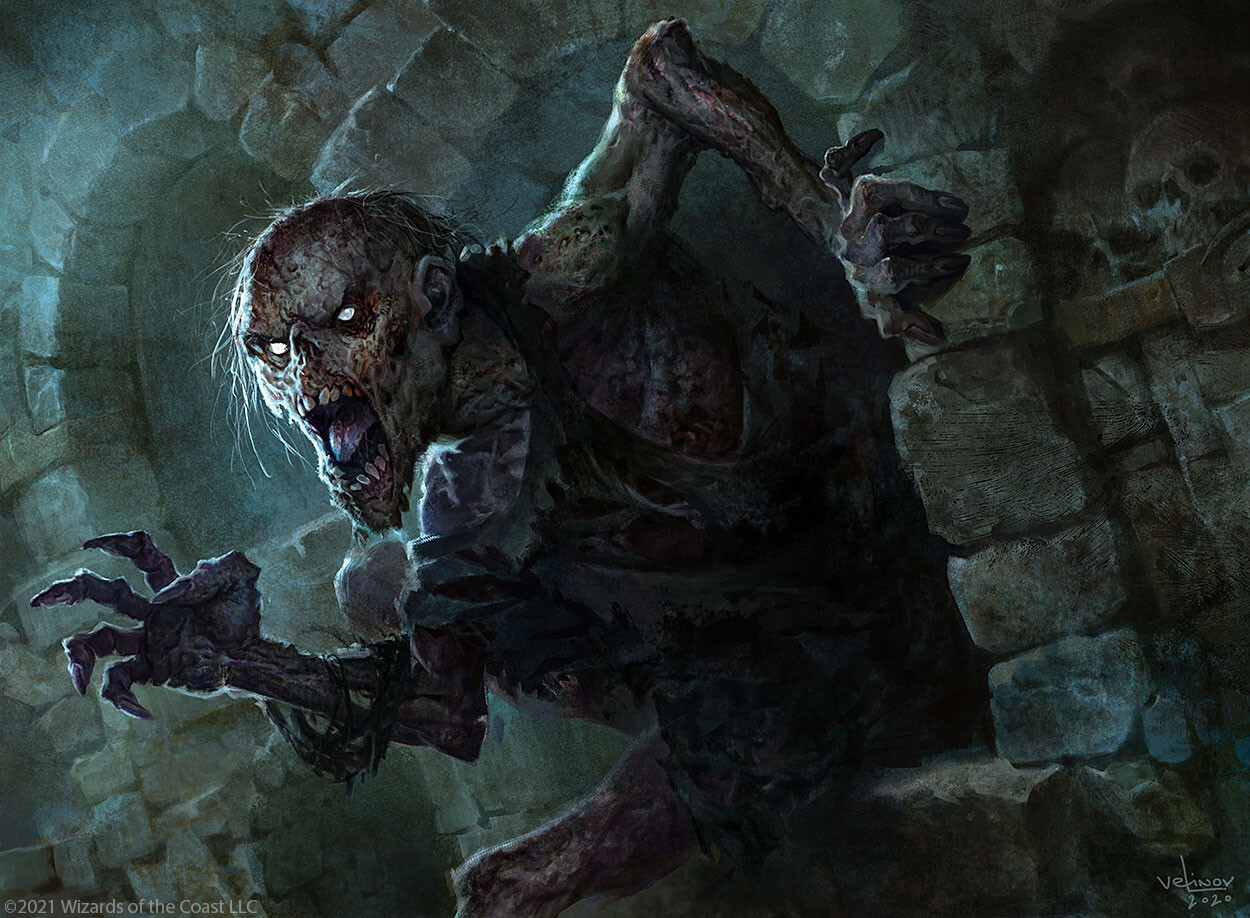 Ghouls are ravenous undead that are characterized by their insatiable appetite for flesh. These creatures act like vermin swarming around places of death and decay such as crypts, graveyards, swamps, or battlefields. However, despite their constant feeding, their appetite can never truly be satisfied.