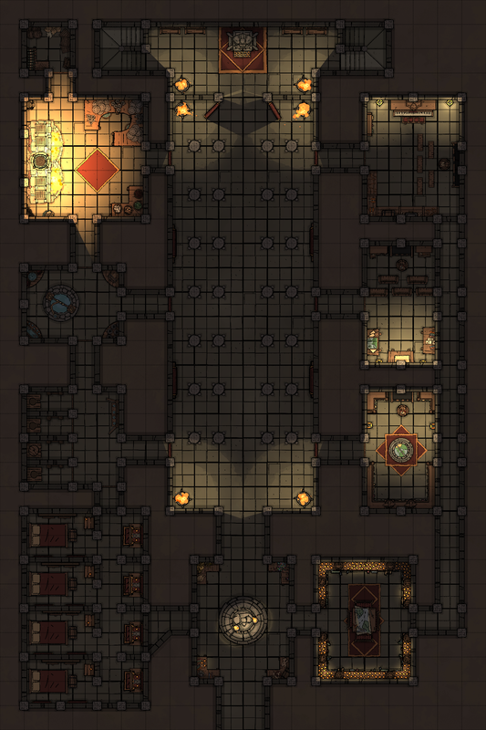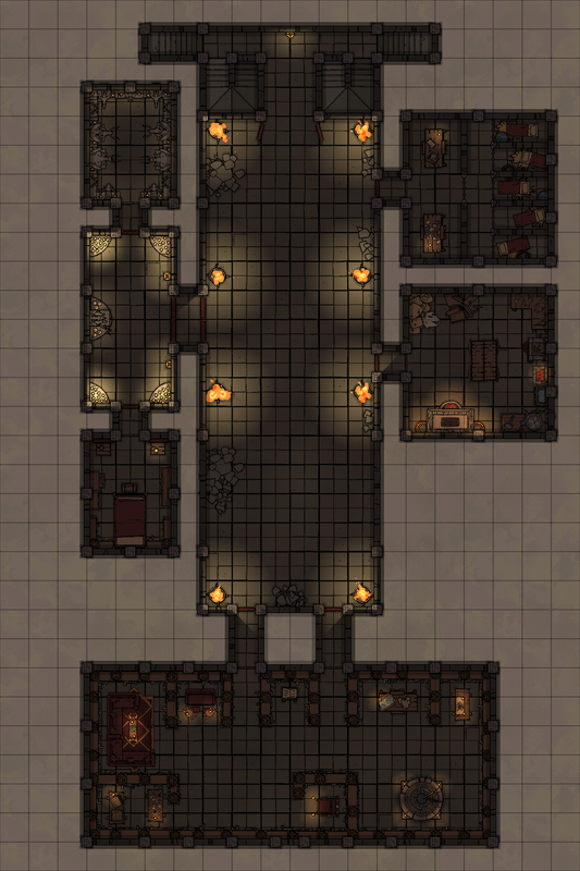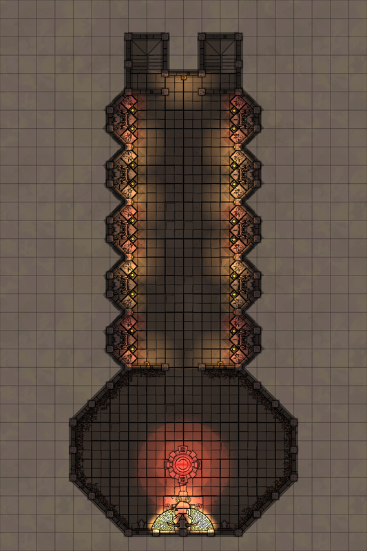 On the first floor, the temple functions as a regular place of worship. This first level is dedicated to a Lawful Good aligned deity known as the Champion of Divine Wisdom. Only the corrupt priests and their dedicated acolytes know the truth lurking in the lower levels of the temple.
