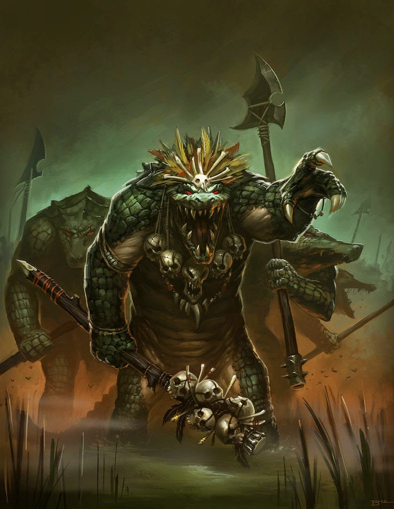 Primitive People: Most tribes live simple lives away from civilization and utilize wood, stone, and bone for their tools and weapons. They often worship fairies, demons, spirits, or powerful monsters that occupy their homelands. Shamans communicate with those beings and bring often blood sacrifices to appease and bargain with them. Gatormen villages are seldom more than a collection of simple huts surrounded by high undergrowth that can be abandoned when required and rebuilt easily elsewhere. They are used to the hardships and dangers of their environment, resulting in little desire for comfort and a high tolerance for deprivations. The tribes often fight with each other, against the other denizens of their homeland, or raid the settlements of outsiders and as a result, most gatormen are skilled warriors.