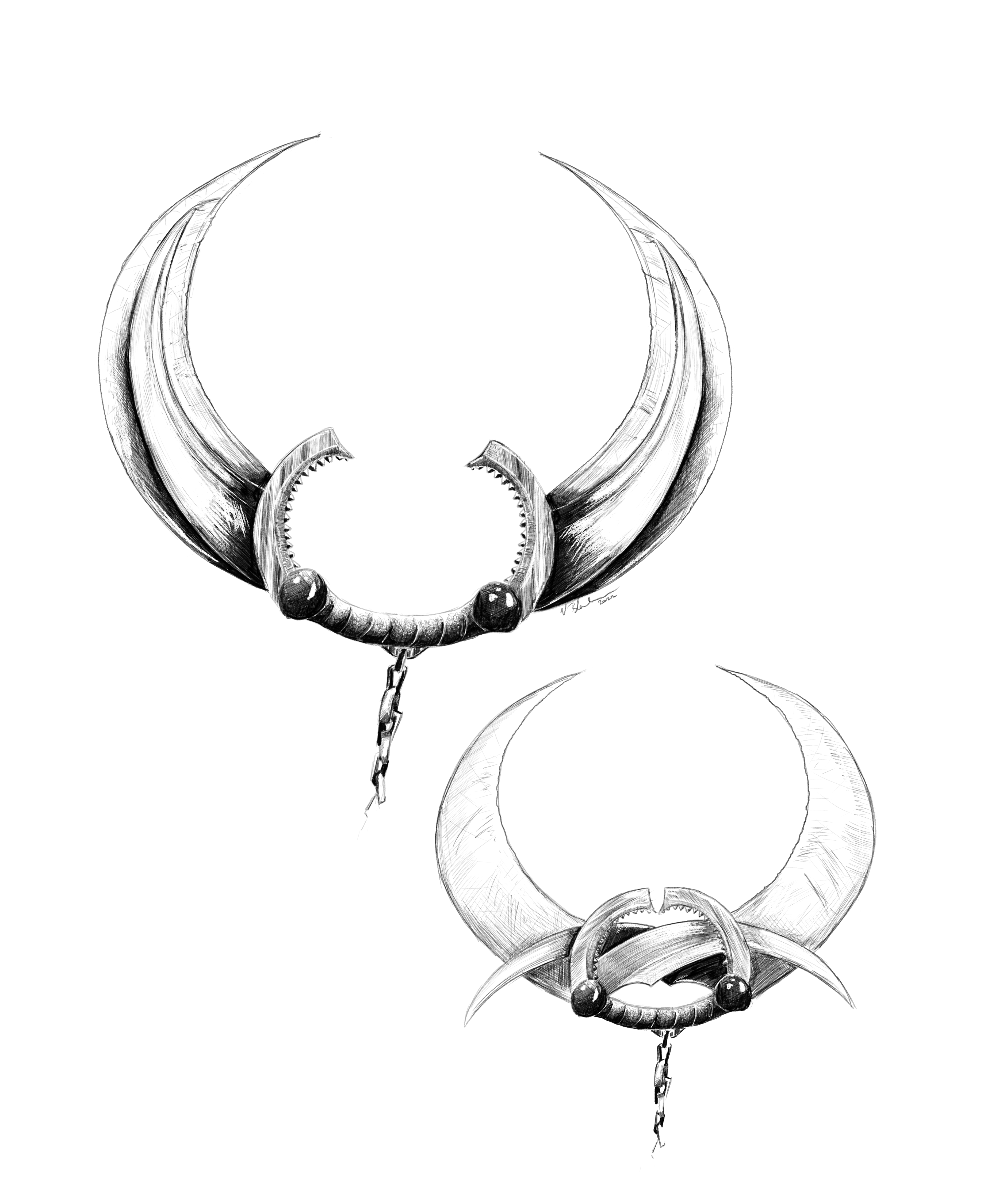 I learned during my travels to Shou Lung about the existence of an ancient superweapon that is now lost to history. A thousand years ago, according to local legend, a brutal warlord almost conquered the world by using a secret device that could chop off people’s heads by the thousands. After a year of research, I came across a partially burned note; just a few words were legible: “and surveying the dead … Fatal Flying Guillotine chopped off their …. head.” I also salvaged bits of a burned painting in the archives of the Royal Art Gallery depicting a young woman wielding a bladed weapon attached to a chain. The blades appeared to be circled around an unlucky fellow’s neck! I attempted a crude drawing of the device in this journal.
