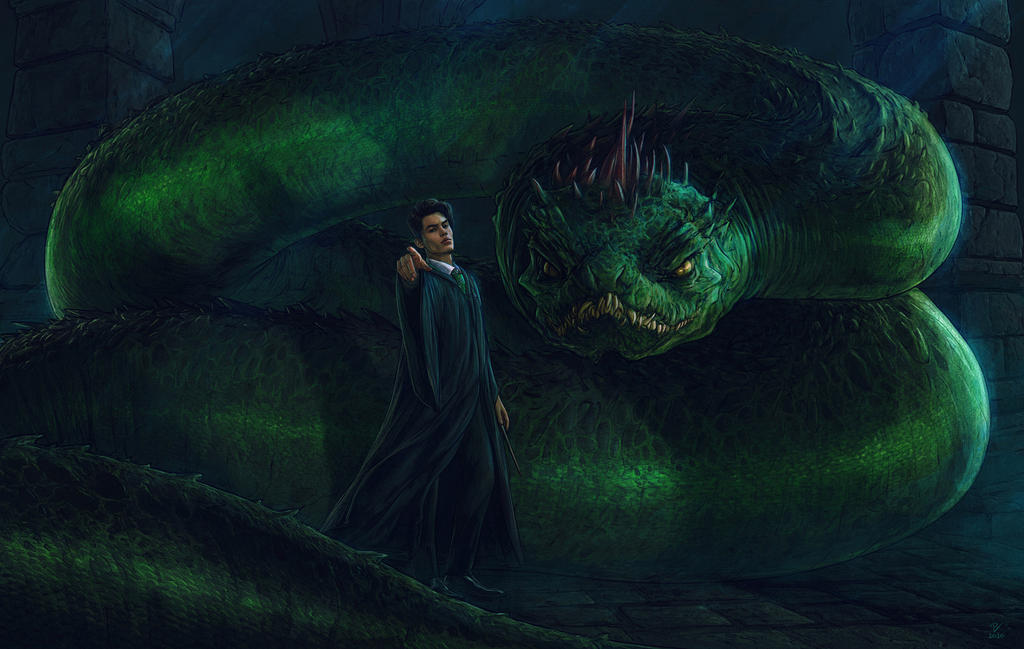 A Dark creature much like a gargantuan, heavy-bodied snake, measuring up to 50 feet in length when fully grown. Unlike a snake, a basilisk has a full row of fangs, all of which contain the most deadly venom for which there is no antidote. Its yellow eyes will kill any creature that looks directly into them, and petrify (frozen in time, as if turned to stone) anyone who catches an indirect glimpse.